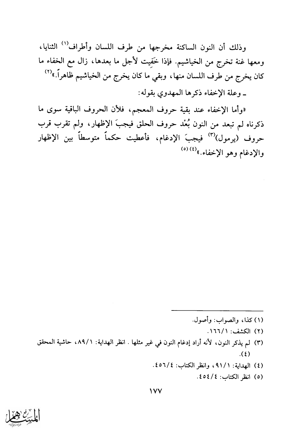 «وأما الإخفاء عند بقية حروف المعجم، فلأن الحروف الباقية سوى ما ذكرناه لم تبعد من النون بعد حروف الحلق فيجب الإظهار، ولم تقرب قرب حروف (يرمول) «3» فيجب الإدغام، فأعطيت حكما متوسطا بين الإظهار والإدغام وهو الإخفاء.» «4» «5»