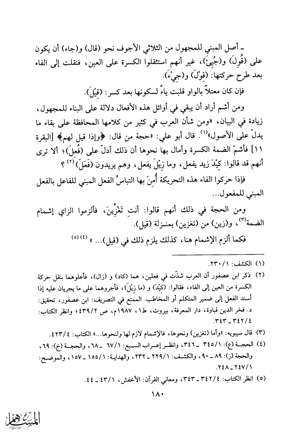 (2) ذكر ابن عصفور أن العرب شذّت في فعلين، هما (كاد) و (زال)، فأعلوهما بنقل حركة الكسرة من العين إلى الفاء، فقالوا: (كيد) و (ما زيل)، فأجروهما على ما يجريان عليه إذا أسند الفعل إلى ضمير المتكلم أو المخاطب. الممتع في التصريف: ابن عصفور، تحقيق: