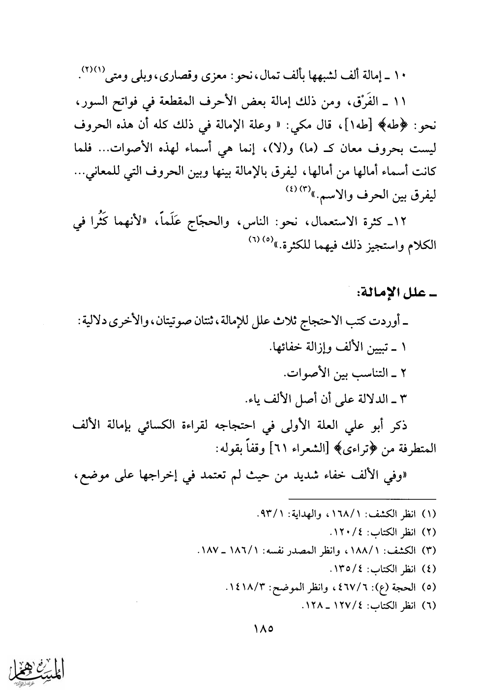 - أوردت كتب الاحتجاج ثلاث علل للإمالة، ثنتان صوتيتان، والأخرى دلالية: