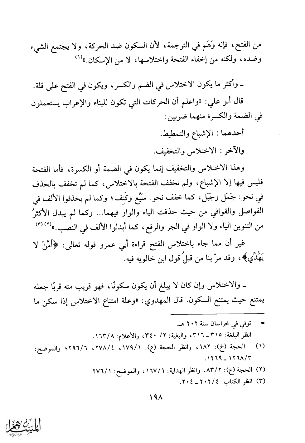 وهذا الاختلاس والتخفيف إنما يكون في الضمة أو الكسرة، فأما الفتحة فليس فيها إلا الإشباع، ولم تخفف الفتحة بالاختلاس، كما لم تخفف بالحذف في نحو: جمل وجبل، كما خفف نحو: سبع وكتف؛ وكما لم يحذفوا الألف في الفواصل والقوافي من حيث حذفت الياء والواو فيهما ... وكما لم يبدل الأكثر من التنوين الياء ولا الواو في الجر والرفع، كما أبدلوا الألف في النصب.» «2» «3»