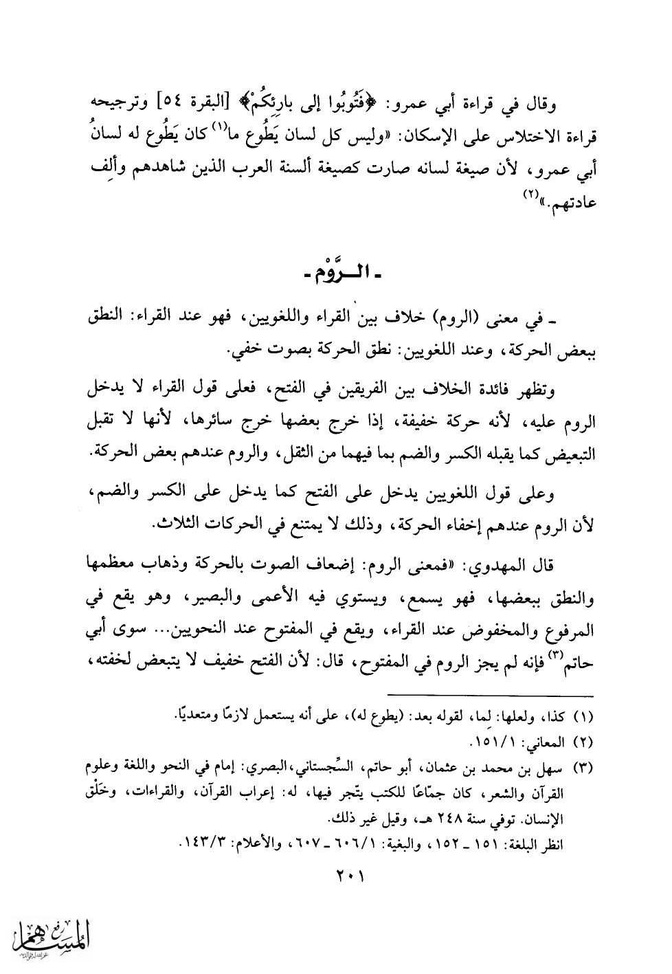 - في معنى (الروم) خلاف بين القراء واللغويين، فهو عند القراء: النطق ببعض الحركة، وعند اللغويين: نطق الحركة بصوت خفي.
