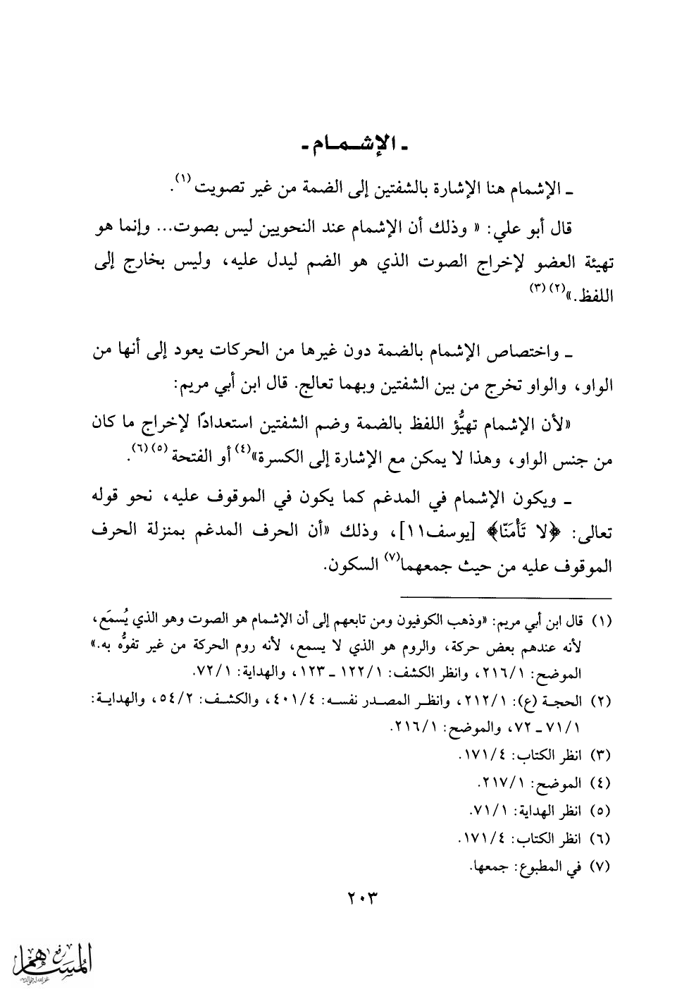 (1) قال ابن أبي مريم: «وذهب الكوفيون ومن تابعهم إلى أن الإشمام هو الصوت وهو الذي يسمع، لأنه عندهم بعض حركة، والروم هو الذي لا يسمع، لأنه روم الحركة من غير تفوّه به.» الموضح: 1/ 216، وانظر الكشف: 1/ 122 - 123، والهداية: 1/ 72.