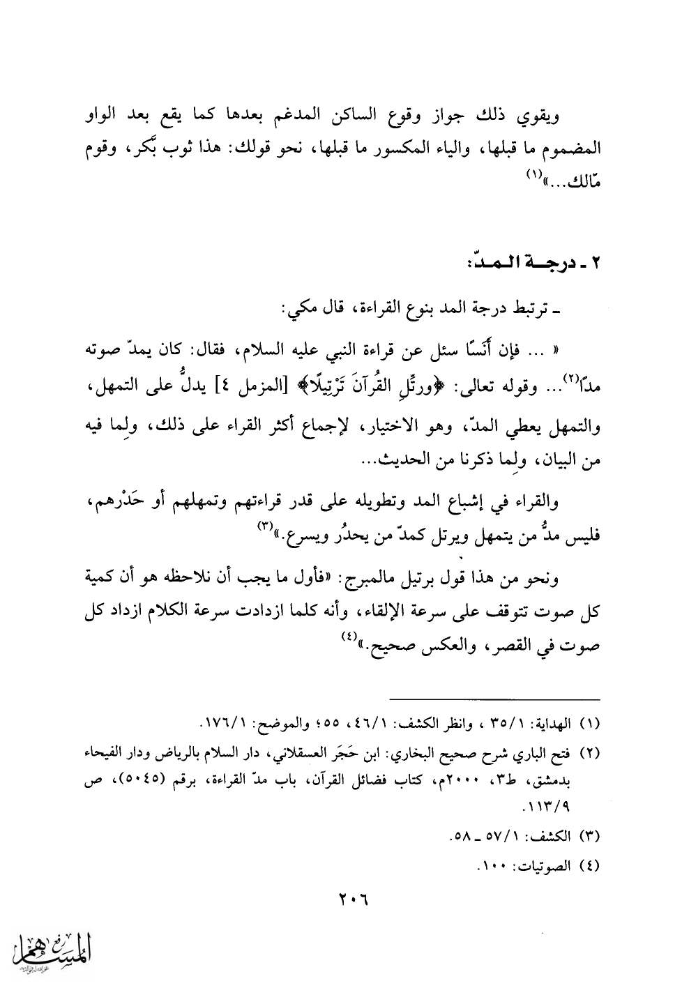 (2) فتح الباري شرح صحيح البخاري: ابن حجر العسقلاني، دار السلام بالرياض ودار الفيحاء بدمشق، ط 3، 2000 م، كتاب فضائل القرآن، باب مدّ القراءة، برقم (5045)، ص 9/ 113.