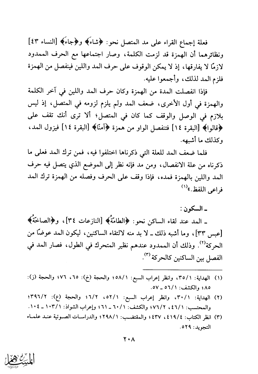 - المد عند لقاء الساكن نحو: الطَّامَّةُ [النازعات 34]، والصَّاخَّةُ [عبس 33]، وما أشبه ذلك- لا بد منه لالتقاء الساكنين، ليكون المد عوضا من الحركة «2». وذلك أن الممدود عندهم نظير المتحرك في الطول، فصار المد في الفصل بين الساكنين كالحركة «3».