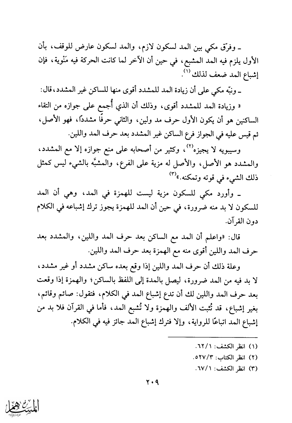 - وفرّق مكي بين المد لسكون لازم، والمد لسكون عارض للوقف، بأن الأول يلزم فيه المد المشبع، في حين أن الآخر لما كانت الحركة فيه منوية، فإن إشباع المد ضعف لذلك «1».