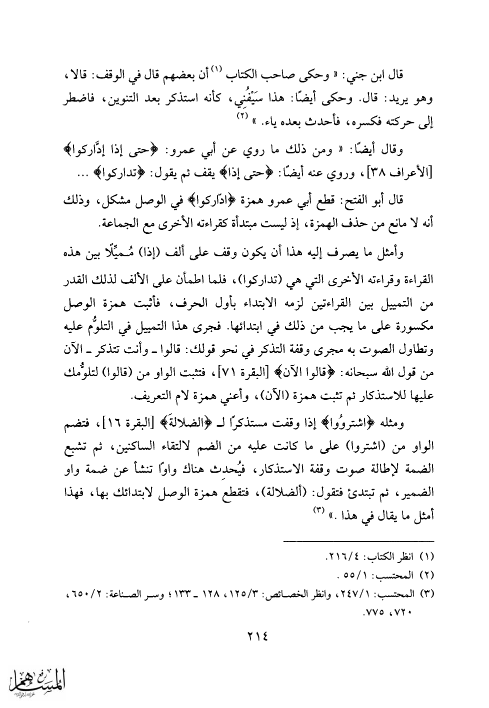 وقال أيضا: «ومن ذلك ما روي عن أبي عمرو: حَتَّى إِذَا ادَّارَكُوا [الأعراف 38]، وروي عنه أيضا: حَتَّى إِذا يقف ثم يقول: تداركوا ...