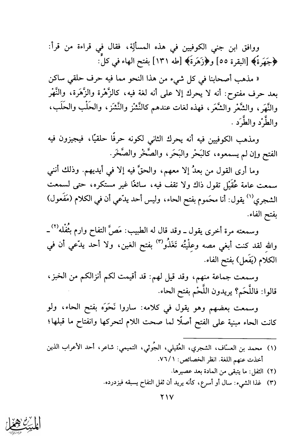 وما أرى القول من بعد إلا معهم، والحقّ فيه إلا في أيديهم. وذلك أنني سمعت عامة عقيل تقول ذاك ولا تقف فيه، سائغا غير مستكره، حتى لسمعت الشجري «1» يقول: أنا محموم بفتح الحاء، وليس أحد يدّعي أن في الكلام (مفعول) بفتح الفاء.