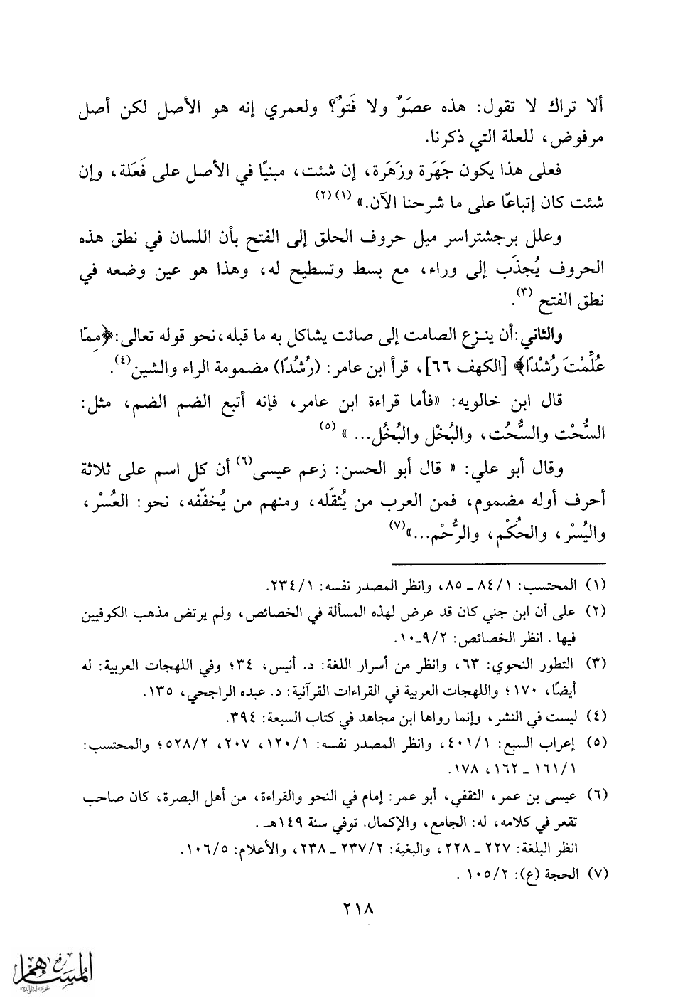 وعلل برجشتراسر ميل حروف الحلق إلى الفتح بأن اللسان في نطق هذه الحروف يجذب إلى وراء، مع بسط وتسطيح له، وهذا هو عين وضعه في نطق الفتح «3».