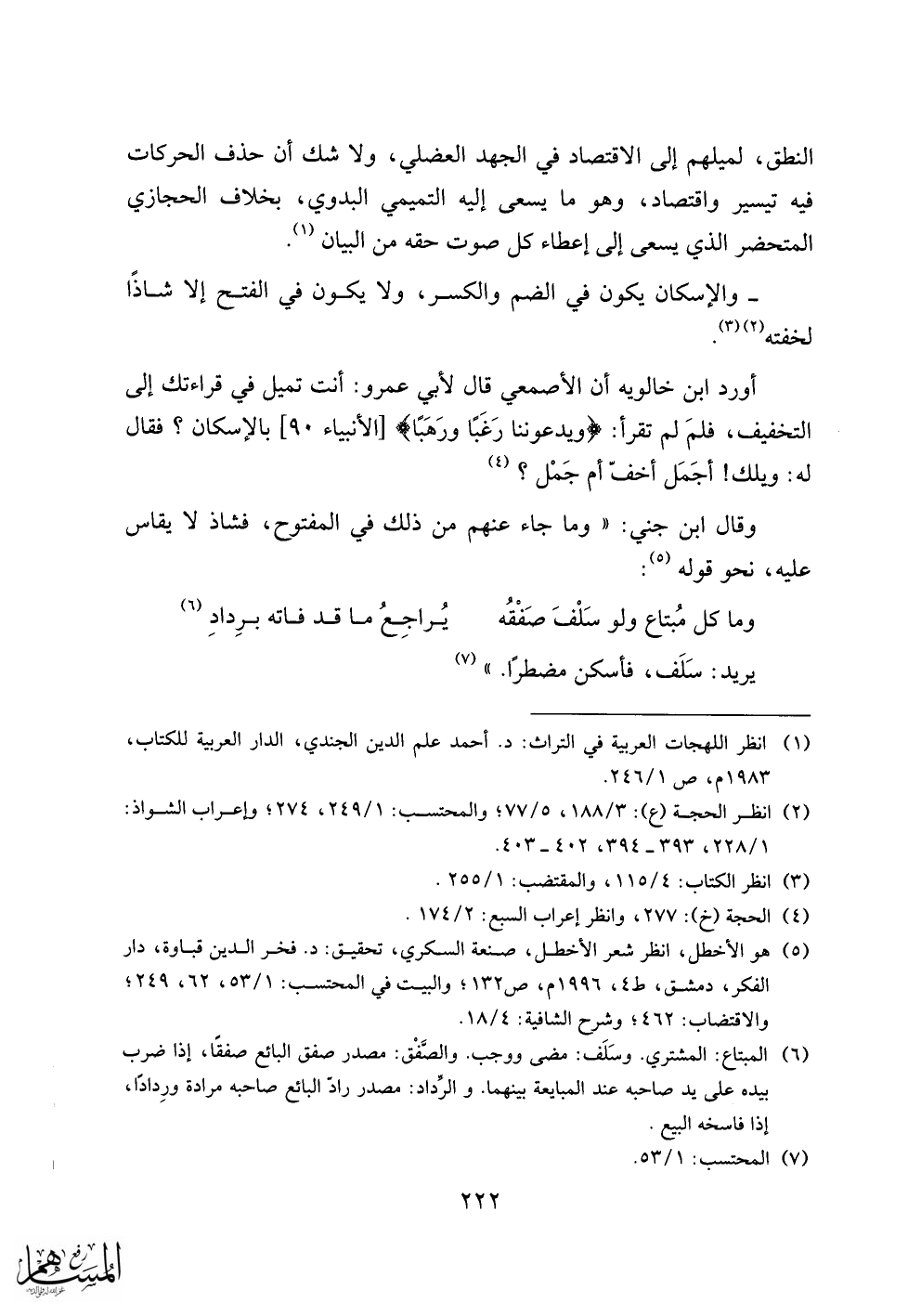 النطق، لميلهم إلى الاقتصاد في الجهد العضلي، ولا شك أن حذف الحركات فيه تيسير واقتصاد، وهو ما يسعى إليه التميمي البدوي، بخلاف الحجازي المتحضر الذي يسعى إلى إعطاء كل صوت حقه من البيان «1».