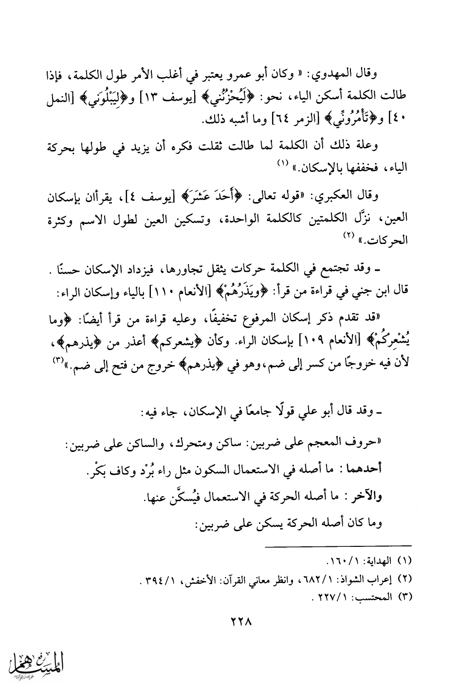 «قد تقدم ذكر إسكان المرفوع تخفيفا، وعليه قراءة من قرأ أيضا: وَما يُشْعِرُكُمْ [الأنعام 109] بإسكان الراء. وكأن يُشْعِرُكُمْ أعذر من يَذَرُهُمْ، لأن فيه خروجا من كسر إلى ضم، وهو في يَذَرُهُمْ خروج من فتح إلى ضم.» «3»