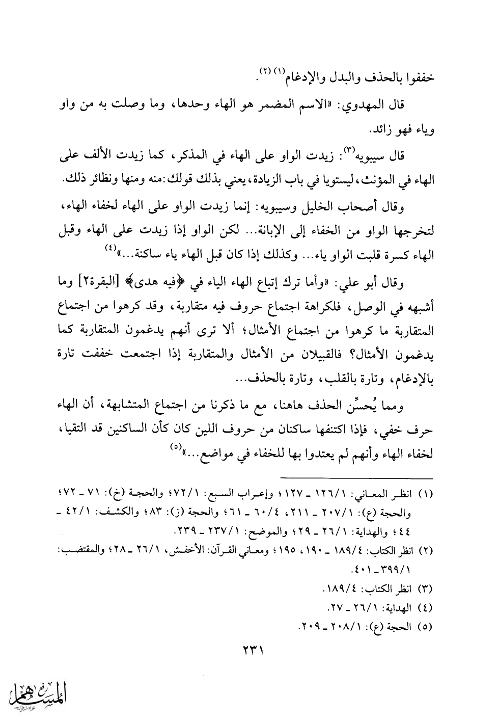 ومما يحسّن الحذف هاهنا، مع ما ذكرنا من اجتماع المتشابهة، أن الهاء حرف خفي، فإذا اكتنفها ساكنان من حروف اللين كان كأن الساكنين قد التقيا، لخفاء الهاء وأنهم لم يعتدوا بها للخفاء في مواضع ... » «5»