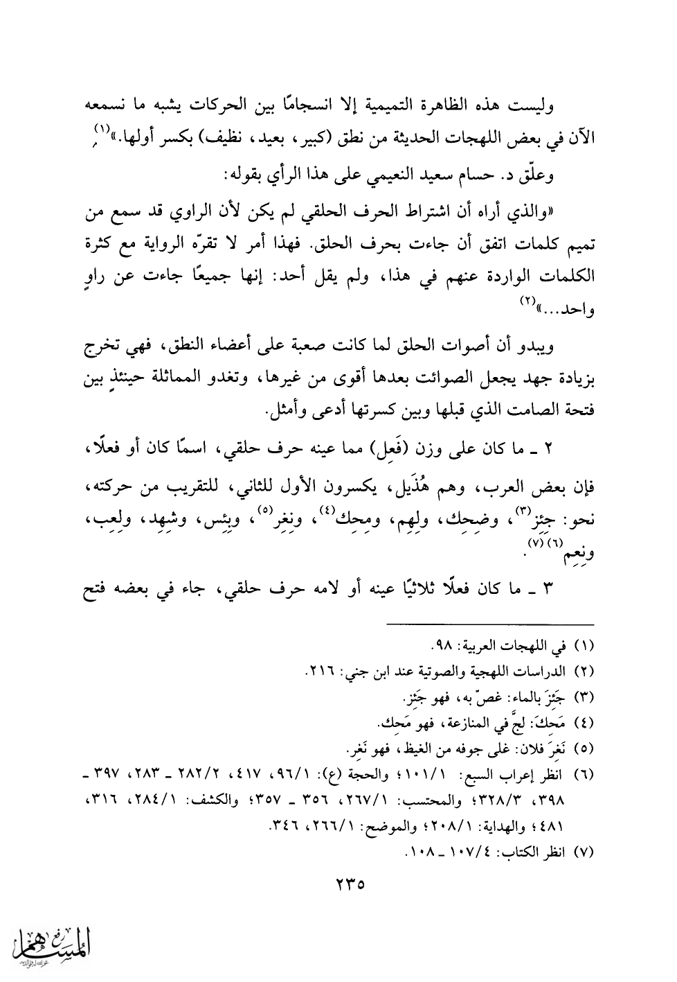 «والذي أراه أن اشتراط الحرف الحلقي لم يكن لأن الراوي قد سمع من تميم كلمات اتفق أن جاءت بحرف الحلق. فهذا أمر لا تقرّه الرواية مع كثرة الكلمات الواردة عنهم في هذا، ولم يقل أحد: إنها جميعا جاءت عن راو واحد ... » «2»