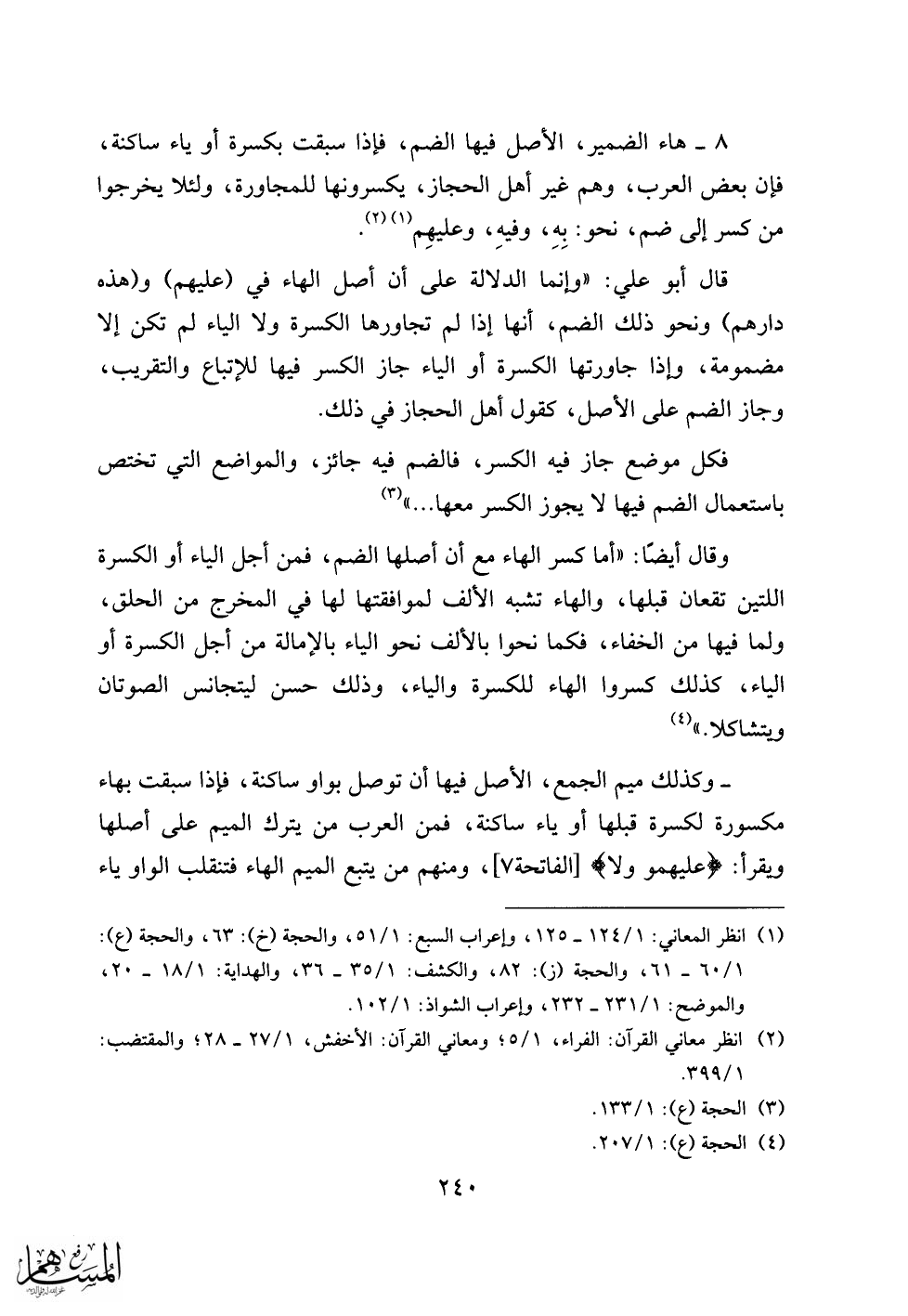 8 - هاء الضمير، الأصل فيها الضم، فإذا سبقت بكسرة أو ياء ساكنة، فإن بعض العرب، وهم غير أهل الحجاز، يكسرونها للمجاورة، ولئلا يخرجوا من كسر إلى ضم، نحو: به، وفيه، وعليهم «1» «2».