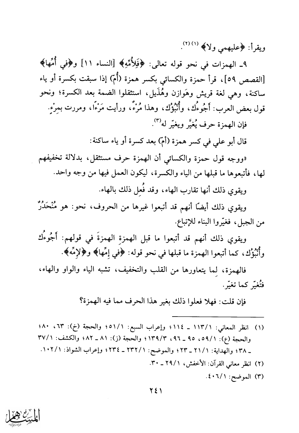 9 - الهمزات في نحو قوله تعالى: فَلِأُمِّهِ [النساء 11] وفِي أُمِّها [القصص 59]، قرأ حمزة والكسائي بكسر همزة (أمّ) إذا سبقت بكسرة أو ياء ساكنة، وهي لغة قريش وهوازن وهذيل، استثقلوا الضمة بعد الكسرة؛ ونحو قول بعض العرب: أجوءك، وأنبؤك، وهذا مرء، ورأيت مرءا، ومررت بمرء.