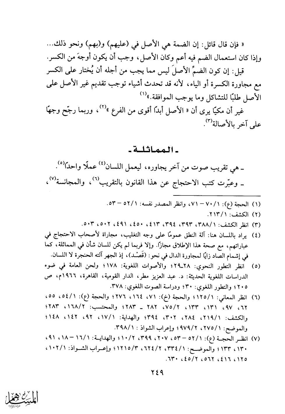 (4) يراد باللسان هنا: آلة النطق عموما على وجه التغليب، مجاراة لأصحاب الاحتجاج في عباراتهم، مع صحة هذا الإطلاق مجازا. وإلا فربما لم يكن للسان شأن في المماثلة، كما في إشمام الصاد زاء لمجاورة الدال في نحو: (قصد)، إذ الجهر آلته الحنجرة لا اللسان.