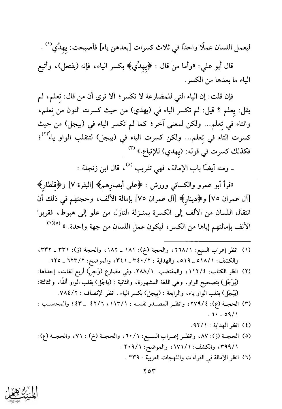 فإن قلت: إن الياء التي للمضارعة لا تكسر؛ ألا ترى أن من قال: تعلم، لم يقل: يعلم؟ قيل: لم تكسر الياء في (يهدي) من حيث كسرت النون من نعلم، والتاء في تعلم ... ولكن لمعنى آخر؛ كما لم تكسر الياء في (ييجل) من حيث كسرت التاء في تعلم ... ولكن كسرت الياء في (ييجل) لتنقلب الواو ياء «2»؛ فكذلك كسرت في قوله: (يهدي) للإتباع.» «3»