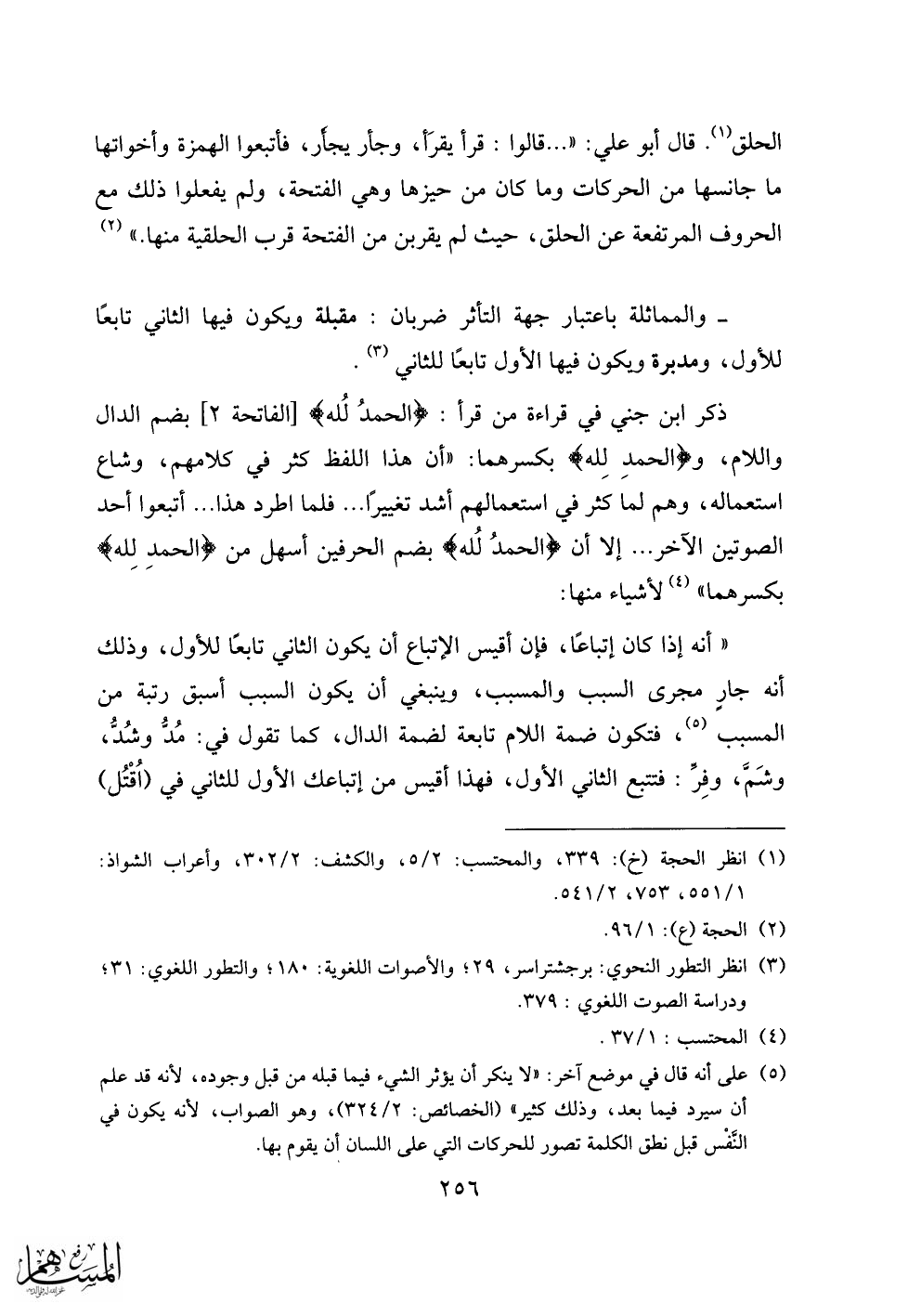ذكر ابن جني في قراءة من قرأ: الْحَمْدُ لِلَّهِ [الفاتحة 2] بضم الدال واللام، والْحَمْدُ لِلَّهِ بكسرهما: «أن هذا اللفظ كثر في كلامهم، وشاع استعماله، وهم لما كثر في استعمالهم أشد تغييرا ... فلما اطرد هذا ... أتبعوا أحد الصوتين الآخر ... إلا أن الْحَمْدُ لِلَّهِ بضم الحرفين أسهل من الْحَمْدُ لِلَّهِ بكسرهما» «4» لأشياء منها:
