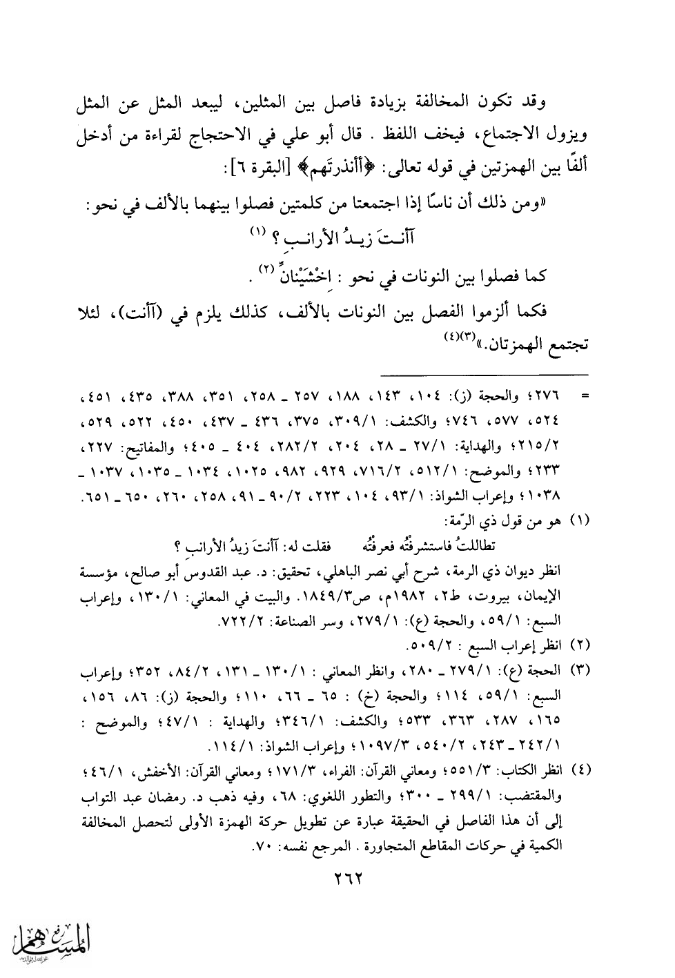 فكما ألزموا الفصل بين النونات بالألف، كذلك يلزم في (آأنت)، لئلا تجتمع الهمزتان.» «3» «4»