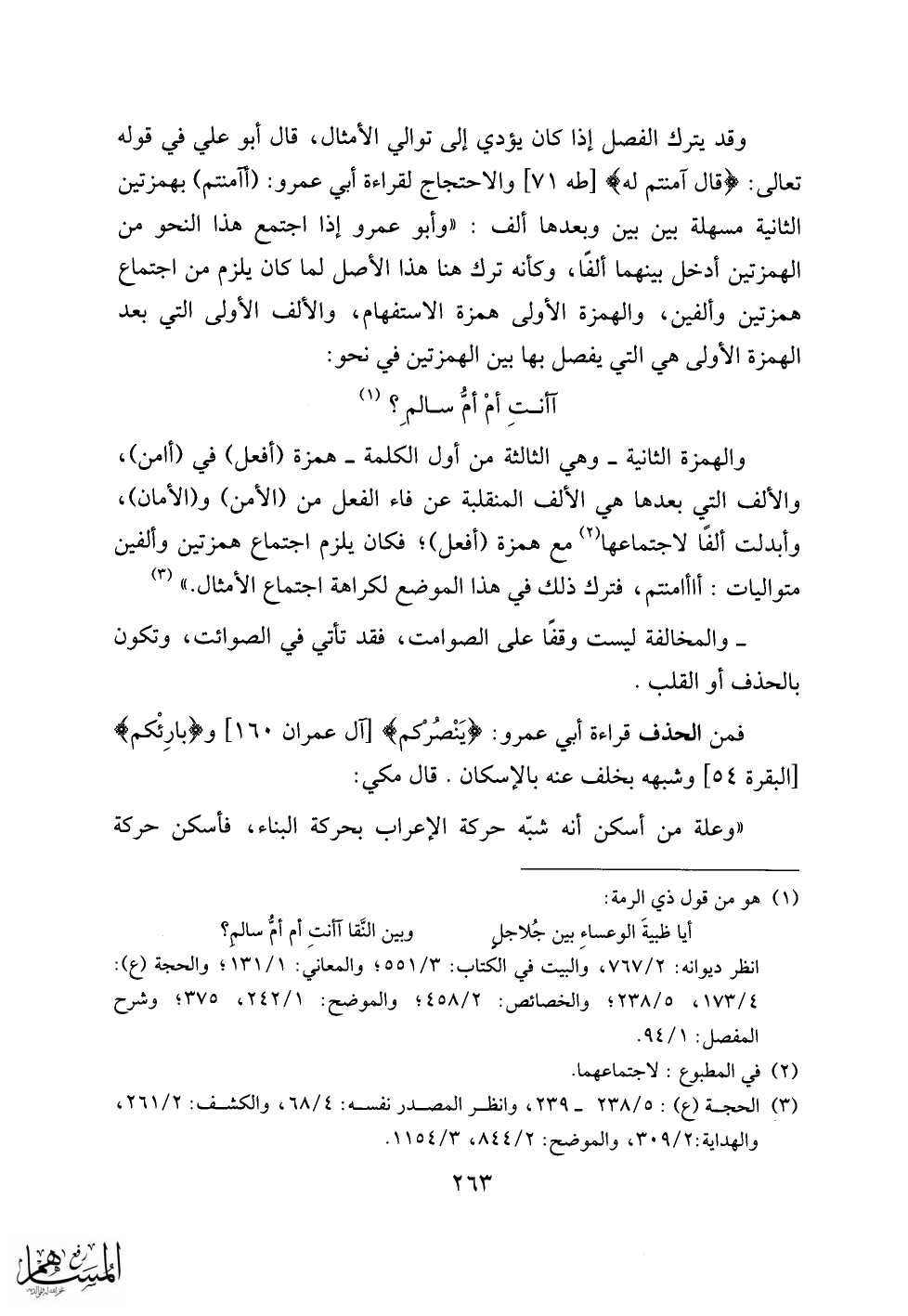 (3) الحجة (ع): 5/ 238 - 239، وانظر المصدر نفسه: 4/ 68، والكشف: 2/ 261، والهداية: 2/ 309، والموضح: 2/ 844، 3/ 1154.