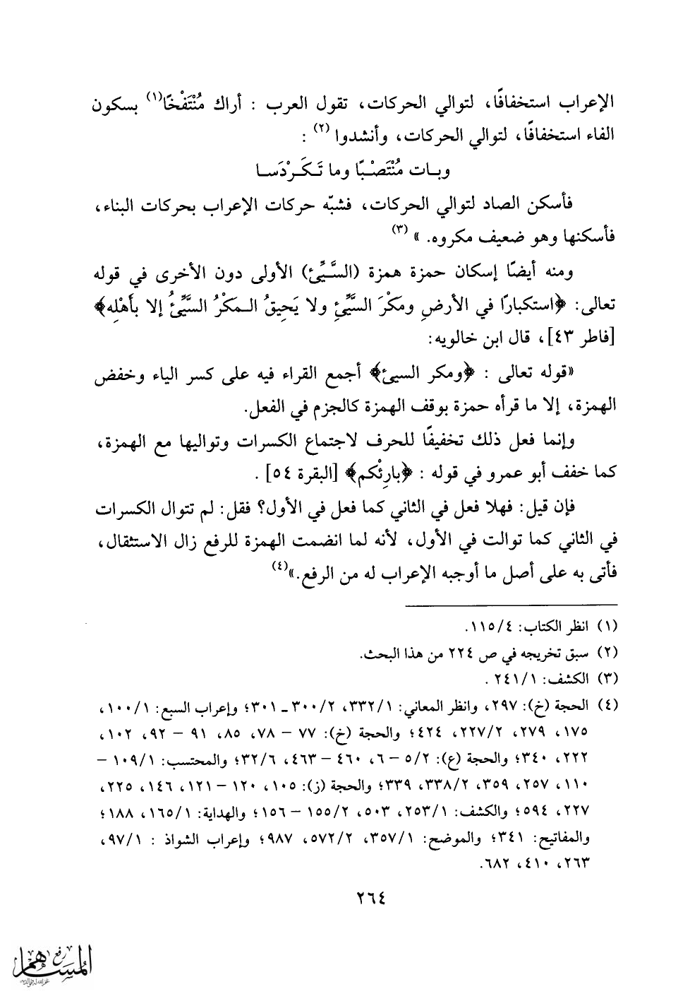 (4) الحجة (خ): 297، وانظر المعاني: 1/ 332، 2/ 300 - 301؛ وإعراب السبع: 1/ 100، 175، 279، 2/ 227، 424؛ والحجة (خ): 77 - 78، 85، 91 - 92، 102، 222، 340؛ والحجة (ع): 2/ 5 - 6، 460 - 463، 6/ 32؛ والمحتسب: 1/ 109 - 110، 257، 359، 2/ 338، 339؛ والحجة (ز): 105، 120 - 121، 146، 225، 227، 594؛ والكشف: 1/ 253، 503، 2/ 155 - 156؛ والهداية: 1/ 165، 188؛ والمفاتيح: 341؛ والموضح: 1/ 357، 2/ 572، 987؛ وإعراب الشواذ: 1/ 97، 263، 410، 682.