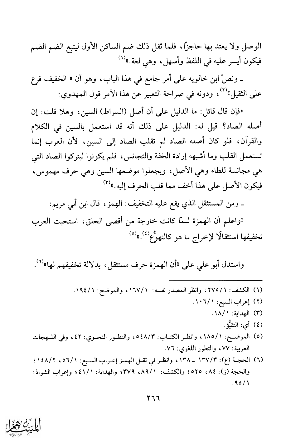 - ونصّ ابن خالويه على أمر جامع في هذا الباب، وهو أن «الخفيف فرع على الثقيل» «2»، ودونه في صراحة التعبير عن هذا الأمر قول المهدوي: