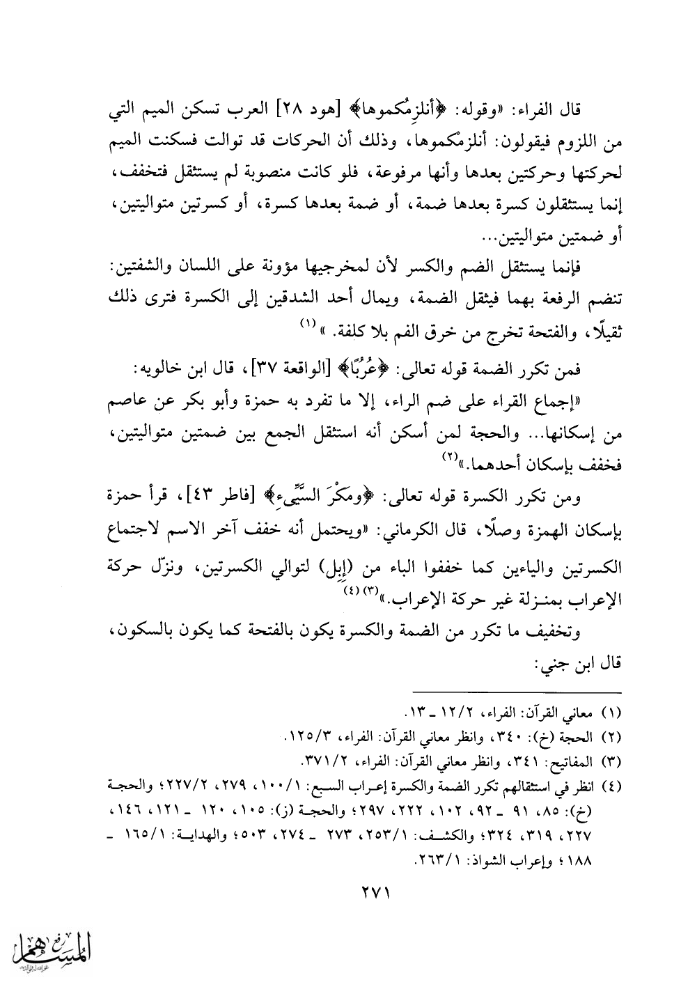 قال الفراء: «وقوله: أَنُلْزِمُكُمُوها [هود 28] العرب تسكن الميم التي من اللزوم فيقولون: أنلزمكموها، وذلك أن الحركات قد توالت فسكنت الميم لحركتها وحركتين بعدها وأنها مرفوعة، فلو كانت منصوبة لم يستثقل فتخفف، إنما يستثقلون كسرة بعدها ضمة، أو ضمة بعدها كسرة، أو كسرتين متواليتين، أو ضمتين متواليتين ...