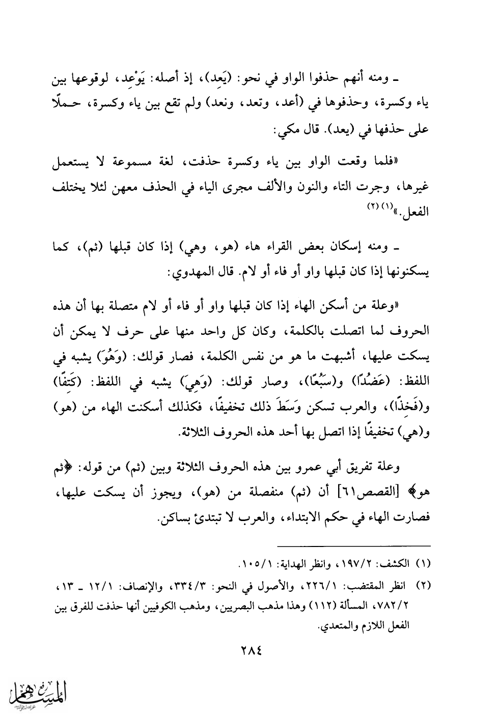 - ومنه إسكان بعض القراء هاء (هو، وهي) إذا كان قبلها (ثم)، كما يسكنونها إذا كان قبلها واو أو فاء أو لام. قال المهدوي: