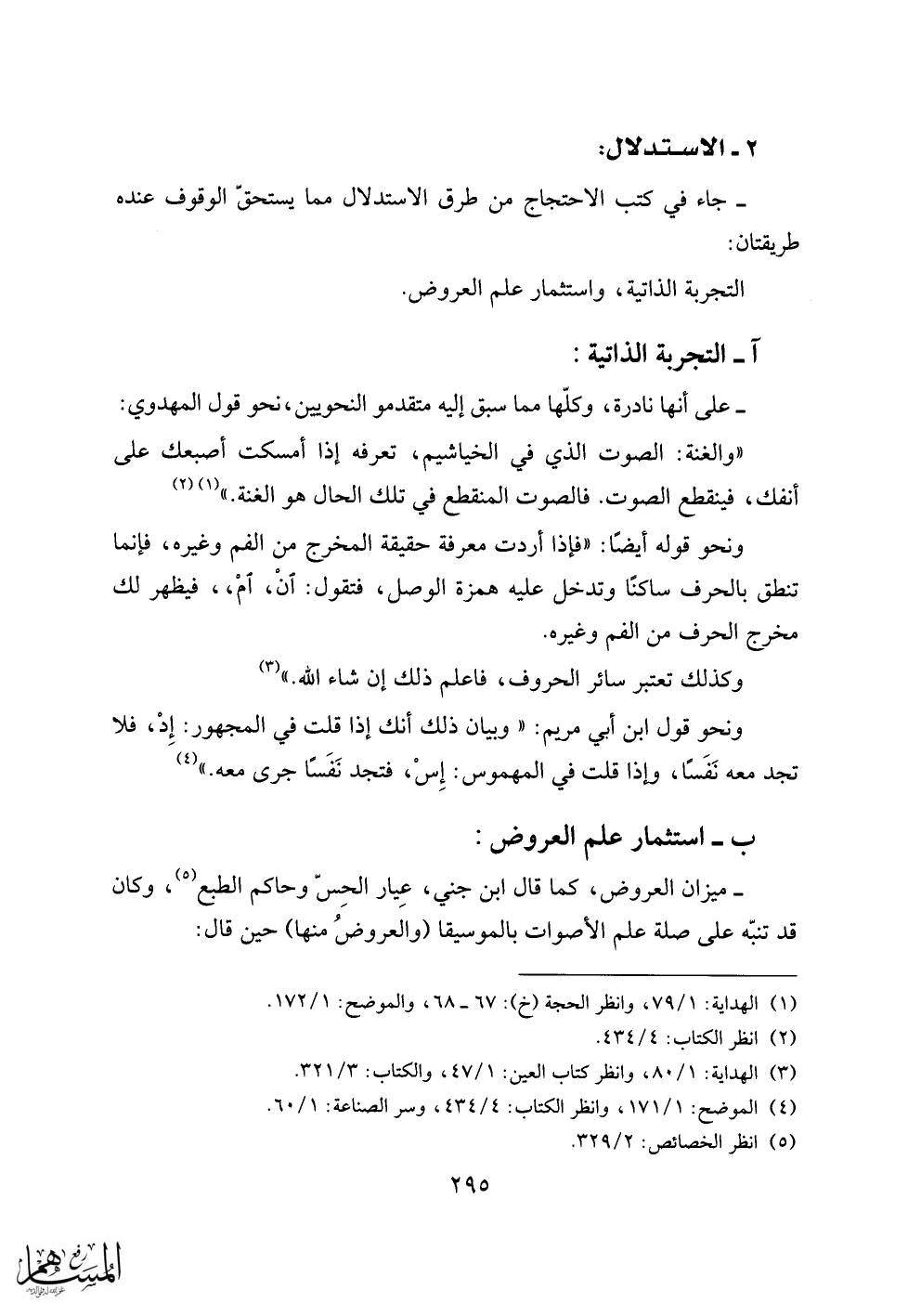 - ميزان العروض، كما قال ابن جني، عيار الحسّ وحاكم الطبع «5»، وكان قد تنبّه على صلة علم الأصوات بالموسيقى (والعروض منها) حين قال:
