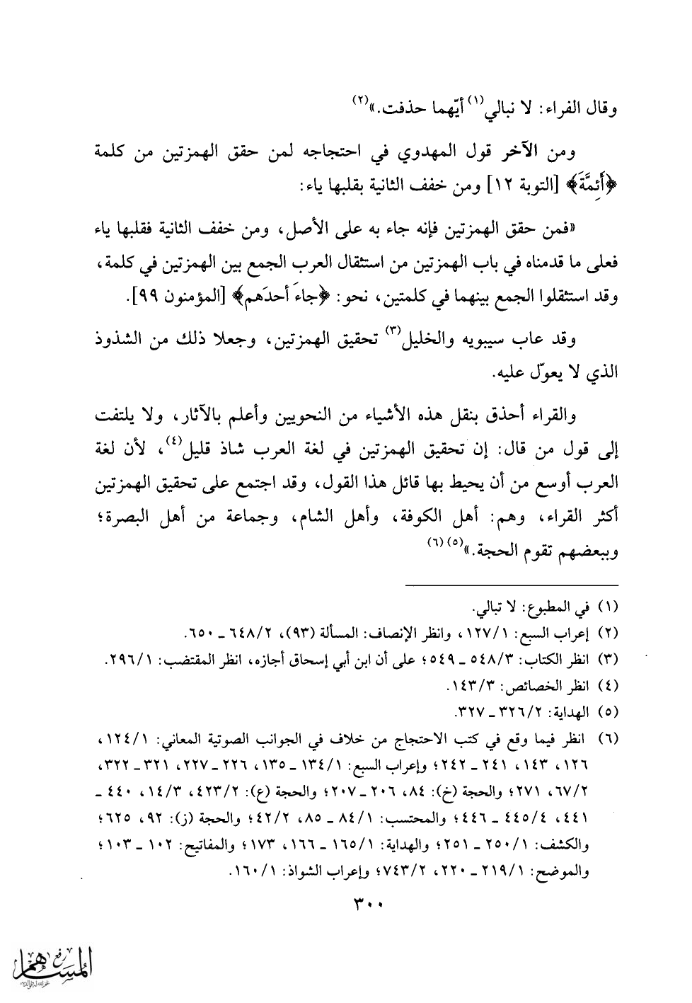 والقراء أحذق بنقل هذه الأشياء من النحويين وأعلم بالآثار، ولا يلتفت إلى قول من قال: إن تحقيق الهمزتين في لغة العرب شاذ قليل «4»، لأن لغة العرب أوسع من أن يحيط بها قائل هذا القول، وقد اجتمع على تحقيق الهمزتين أكثر القراء، وهم: أهل الكوفة، وأهل الشام، وجماعة من أهل البصرة؛ وببعضهم تقوم الحجة.» «5» «6»