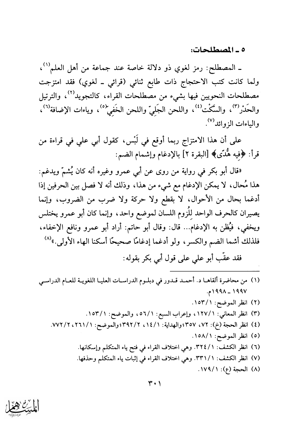 - المصطلح: رمز لغوي ذو دلالة خاصة عند جماعة من أهل العلم «1»، ولما كانت كتب الاحتجاج ذات طابع ثنائي (قرائي- لغوي) فقد امتزجت مصطلحات النحويين فيها بشيء من مصطلحات القراء، كالتجويد «2»، والترتيل والحدر «3»، والسّكت «4»، واللحن الجليّ واللحن الخفيّ «5»، وياءات الإضافة «6»، والياءات الزوائد «7».