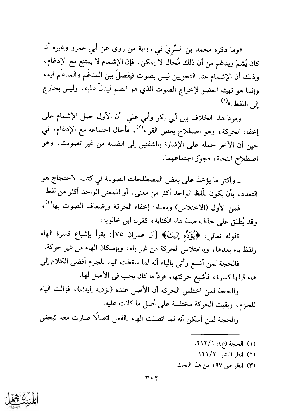 «وما ذكره محمد بن السّريّ في رواية من روى عن أبي عمرو وغيره أنه كان يشمّ ويدغم من أن ذلك محال لا يمكن، فإن الإشمام لا يمتنع مع الإدغام، وذلك أن الإشمام عند النحويين ليس بصوت فيفصل بين المدغم والمدغم فيه، وإنما هو تهيئة العضو لإخراج الصوت الذي هو الضم ليدلّ عليه، وليس بخارج إلى اللفظ.» «1»