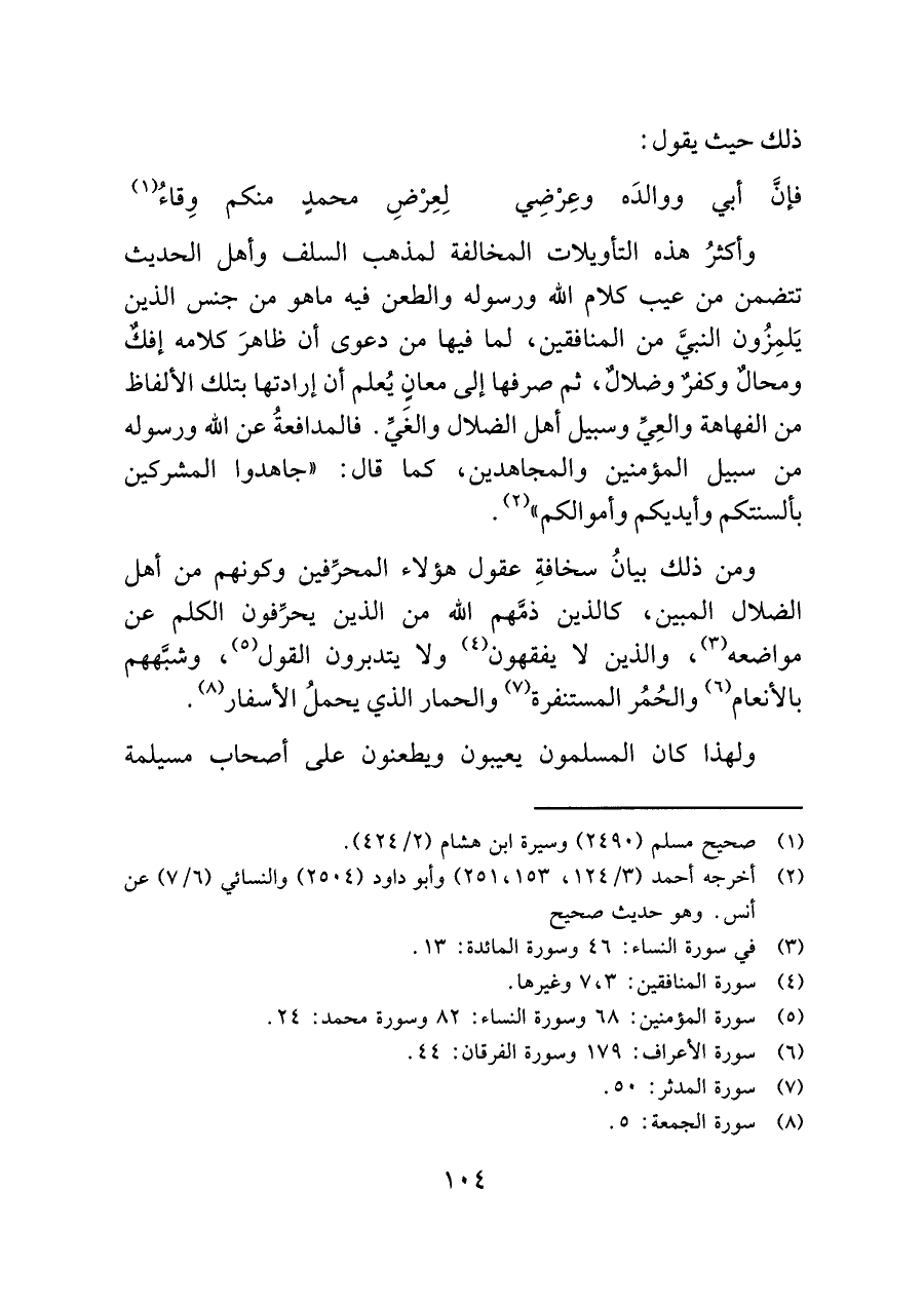 وأكثرُ هذه التأويلات المخالفة لمذهب السلف وأهل الحديث تتضمن من عيب كلام الله ورسوله والطعن فيه ما هو من جنس الذين يَلمِزُون النبيَّ من المنافقين، لما فيها من دعوى أن ظاهرَ كلامه إفكٌ ومحالٌ وكفرٌ وضلالٌ، ثم صرفها إلى معانٍ يُعلم أن إرادتها بتلك الألفاظ من الفهاهة والعِيِّ وسبيل أهل الضلال والغَيِّ. فالمدافعةُ عن الله ورسوله من سبيل المؤمنين والمجاهدين، كما قال: "جاهدوا المشركين بألسنتكم وأيديكم وأموالكم" (¬٢).