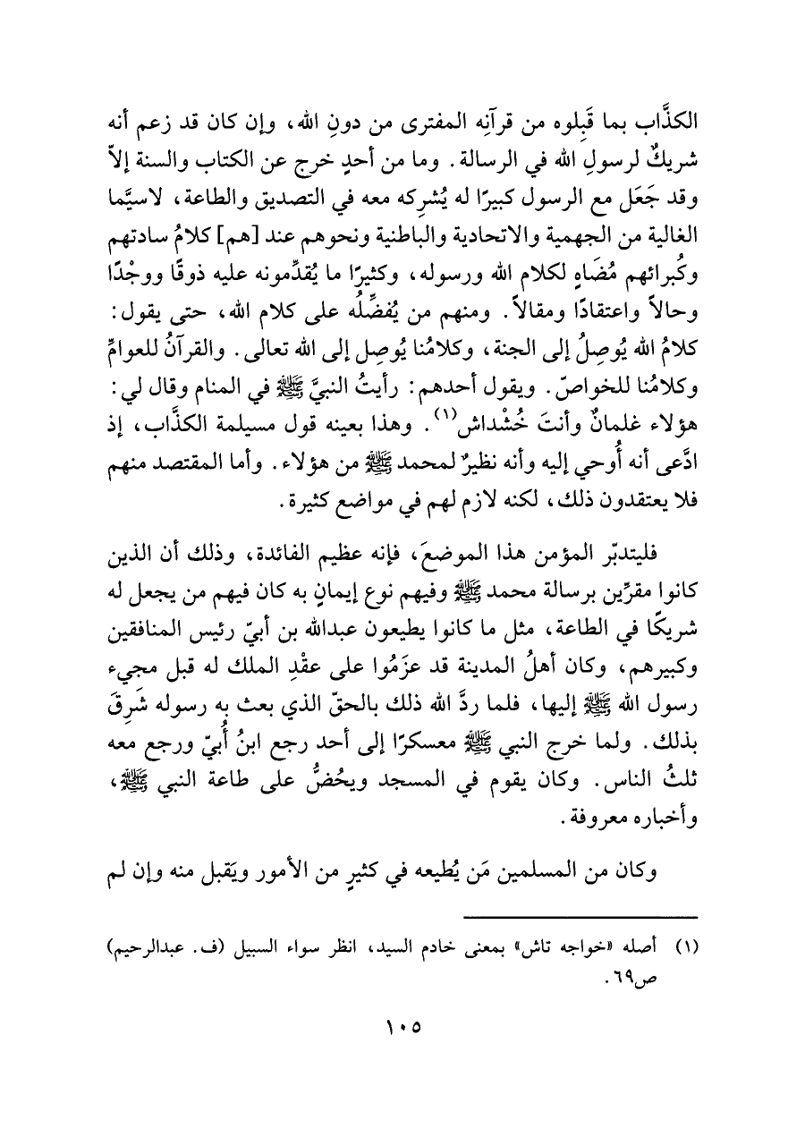 الكذَّاب بما قَبِلوه من قرآنِه المفترى من دونِ الله، وإن كان قد زعم أنه شريكٌ لرسولِ الله في الرسالة. وما من أحدٍ خرج عن الكتاب والسنة إلّا وقد جَعَل مع الرسول كبيرًا له يُشرِكه معه في التصديق والطاعة، لا سيَّما الغالية من الجهمية والاتحادية والباطنية ونحوهم عند [هم] كلامُ سادتهم وكُبرائهم مُضاهٍ لكلام الله ورسوله، وكثيرًا ما يُقدِّمونه عليه ذوقًا ووجْدًا وحالًا واعتقادًا ومقالًا. ومنهم من يُفضِّلُه على كلام الله، حتى يقول: كلامُ الله يُوصِلُ إلى الجنة، وكلامُنا يُوصِل إلى الله تعالى. والقرآنُ للعوامِّ وكلامُنا للخواصّ. ويقول أحدهم: رأيتُ النبيَّ صلى الله عليه وسلم في المنام وقال لي: هؤلاء غلمانٌ وأنت خُشْداش (¬١). وهذا بعينه قول مسيلمة الكذَّاب، إذ ادَّعى أنه أُوحي إليه وأنه نظيرٌ لمحمد صلى الله عليه وسلم من هؤلاء. وأما المقتصد منهم فلا يعتقدون ذلك، لكنه لازم لهم في مواضع كثيرة.
