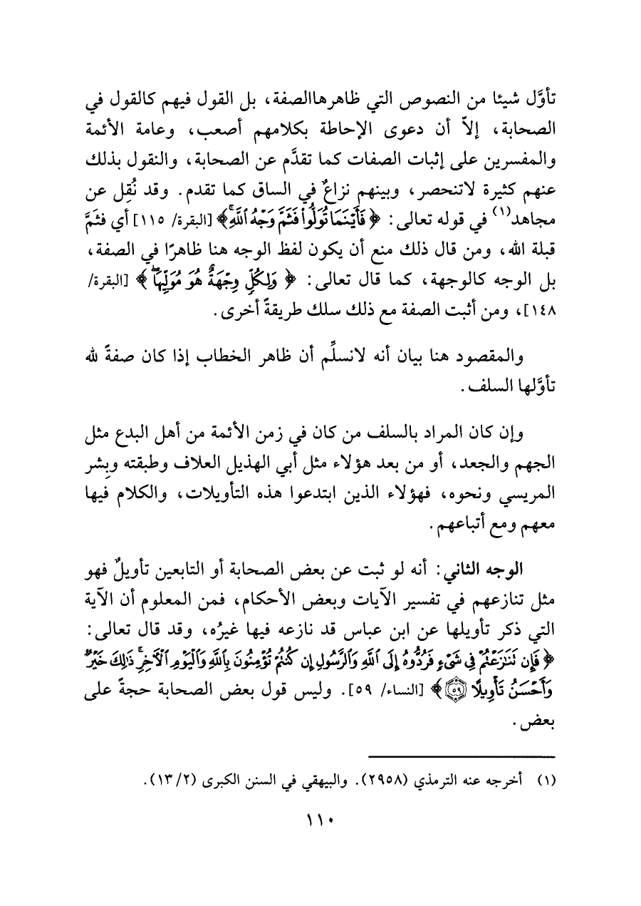 تأوَّل شيئًا من النصوص التي ظاهرها الصفة، بل القول فيهم كالقول في الصحابة، إلّا أن دعوى الإحاطة بكلامهم أصعب، وعامة الأئمة والمفسرين على إثبات الصفات كما تقدَّم عن الصحابة، والنقول بذلك عنهم كثيرة لا تنحصر، وبينهم نزاعٌ في الساق كما تقدم. وقد نُقِلَ عن مجاهد (¬١) في قوله تعالى: {فَأَيْنَمَا تُوَلُّوا فَثَمَّ وَجْهُ اللَّهِ} [البقرة/ ١١٥] أي فثّمَّ قبلة الله، ومن قال ذلك منع أن يكون لفظ الوجه هنا ظاهرًا في الصفة، بل الوجه كالوجهة، كما قال تعالى: {وَلِكُلٍّ وِجْهَةٌ هُوَ مُوَلِّيهَا} [البقرة/ ١٤٨]، ومن أثبت الصفة مع ذلك سلك طريقةً أخرى.