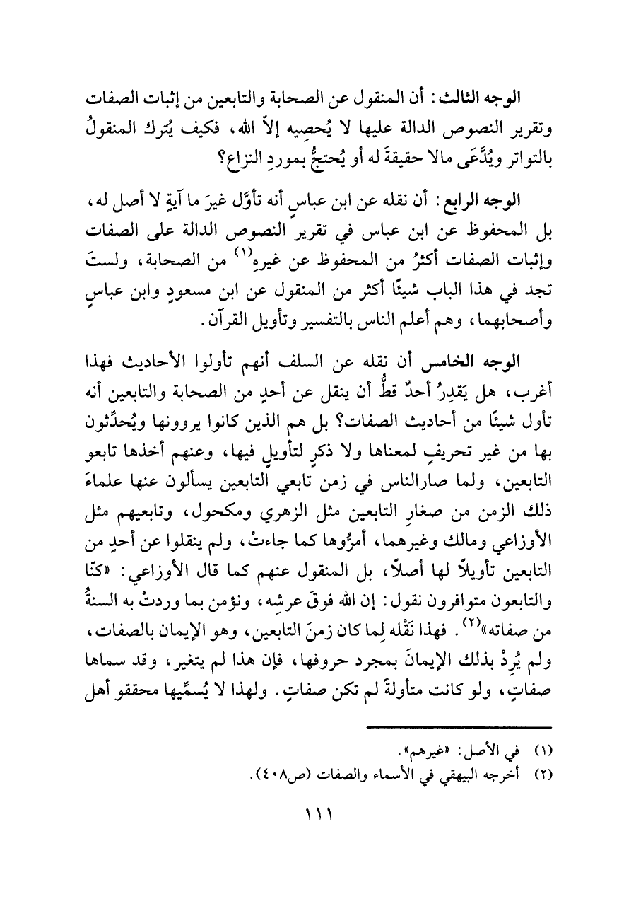 الوجه الثالث: أن المنقول عن الصحابة والتابعين من إثبات الصفات وتقرير النصوص الدالة عليها لا يُحصِيه إلّا الله، فكيف يُترك المنقولُ بالتواتر ويُدَّعَى ما لا حقيقةَ له أو يُحتجُّ بموردِ النزاع؟