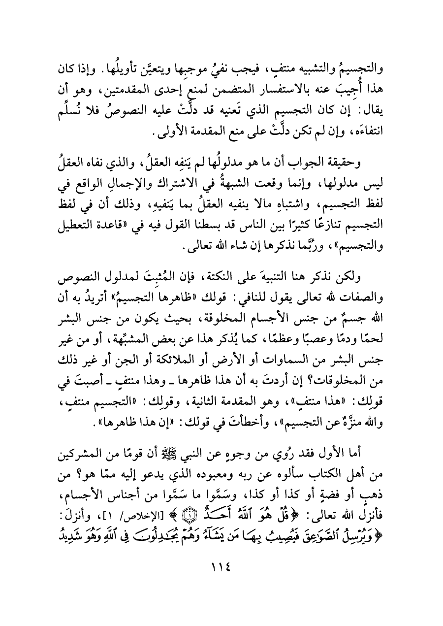 ولكن نذكر هنا التنبيهَ على النكتة، فإن المُثبِتَ لمدلول النصوص والصفات لله تعالى يقول للنافي: قولك "ظاهرها التجسيمُ" أتريدُ به أن الله جسمٌ من جنس الأجسام المخلوقة، بحيث يكون من جنس البشر لحمًا ودمًا وعصبًا وعظمًا، كما يُذكر هذا عن بعض المشبِّهة، أو من غير جنس البشر من السماوات أو الأرض أو الملائكة أو الجن أو غير ذلك من المخلوقات؟ إن أردتَ به أن هذا ظاهرها - وهذا منتفٍ - أصبتَ في قولِك: "هذا منتفٍ"، وهو المقدمة الثانية، وقولِك: "التجسيم منتفٍ، والله منزَّهٌ عن التجسيم"، وأخطأتَ في قولك: "إن هذا ظاهرها".