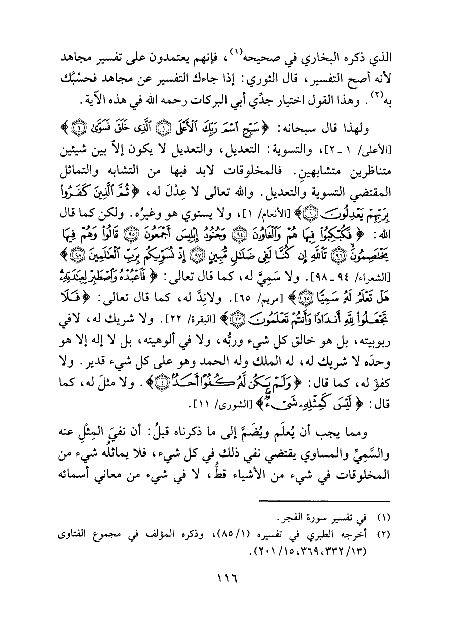 ولهذا قال سبحانه: {سَبِّحِ اسْمَ رَبِّكَ الْأَعْلَى (١) الَّذِي خَلَقَ فَسَوَّى (٢)} [الأعلى/ ١ - ٢]، والتسوية: التعديل، والتعديل لا يكون إلّا بين شيئين متناظرين متشابهينِ. فالمخلوقات لا بد فيها من التشابه والتماثل المقتضي التسوية والتعديل. والله تعالى لا عِدْلَ له، {ثُمَّ الَّذِينَ كَفَرُوا بِرَبِّهِمْ يَعْدِلُونَ} [الأنعام/ ١]، ولا يستوي هو وغيرُه. ولكن كما قال الله: {فَكُبْكِبُوا فِيهَا هُمْ وَالْغَاوُونَ (٩٤) وَجُنُودُ إِبْلِيسَ أَجْمَعُونَ (٩٥) قَالُوا وَهُمْ فِيهَا يَخْتَصِمُونَ (٩٦) تَاللَّهِ إِنْ كُنَّا لَفِي ضَلَالٍ مُبِينٍ (٩٧) إِذْ نُسَوِّيكُمْ بِرَبِّ الْعَالَمِينَ (٩٨)} [الشعراء/ ٩٤ - ٩٨]. ولا سَمِيَّ له، كما قال تعالى: {فَاعْبُدْهُ وَاصْطَبِرْ لِعِبَادَتِهِ هَلْ تَعْلَمُ لَهُ سَمِيًّا} [مريم/ ٦٥]. ولا نِدَّ له، كما قال تعالى: {فَلَا تَجْعَلُوا لِلَّهِ أَندَادًا وَأَنتُمْ تَعْلَمُونَ} [البقرة/ ٢٢]. ولا شريك له، لا في ربوبيته، بل هو خالق كل شيء وربُّه، ولا في ألوهيته، بل لا إله إلا هو وحدَه لا شريك له، له الملك وله الحمد وهو على كل شيء قدير. ولا كفؤَ له، كما قال: {وَلَمْ يَكُن لَّهُ كُفُوًا أَحَدٌ}. ولا مثلَ له، كما قال: {لَيْسَ كَمِثْلِهِ شَيْءٌ} [الشورى/ ١١].