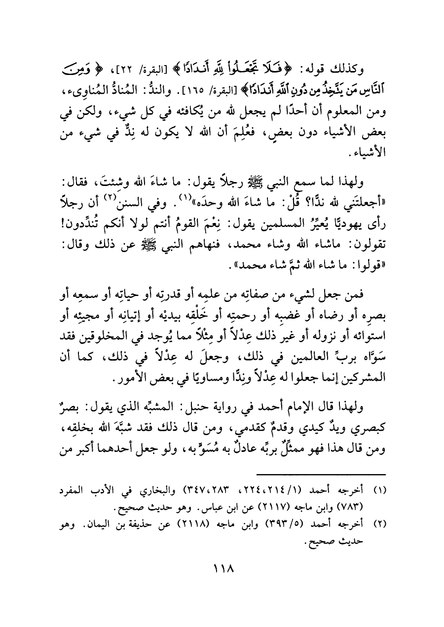 ولهذا لما سمع النبي صلى الله عليه وسلم رجلًا يقول: ما شاءَ الله وشِئتَ، فقال: "أجعلتَني لله ندًّا؟ قُلْ: ما شاءَ الله وحدَه" (¬١). وفى السنن (¬٢) أن رجلًا رأى يهوديًّا يُعيِّرُ المسلمين يقول: نِعْمَ القومُ أنتم لولا أنكم تُندِّدون! تقولون: ما شاء الله وشاء محمد، فنهاهم النبي صلى الله عليه وسلم عن ذلك وقال: "قولوا: ما شاء الله ثمَّ شاء محمد".