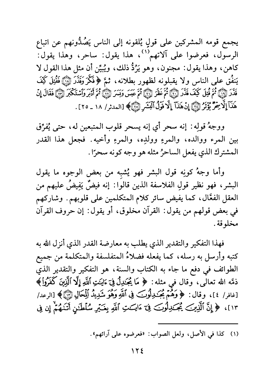 فهذا التفكير والتقدير الذي يطلب به معارضة القدر الذي أنزل الله به كتبه وأرسل به رسله، كما يفعله فضلاءُ المتفلسفة والمتكلمة من جميع الطوائف في دفع ما جاء به الكتاب والسنة، هو التفكير والتقدير الذي ذمَّه الله تعالى، وقال في مثله: {مَا يُجَادِلُ فِي آيَاتِ اللَّهِ إِلَّا الَّذِينَ كَفَرُوا} [غافر/ ٤]، وقال: {وَهُمْ يُجَادِلُونَ فِي اللَّهِ وَهُوَ شَدِيدُ الْمِحَالِ} [الرعد/ ١٣]، {إِنَّ الَّذِينَ يُجَادِلُونَ فِي آيَاتِ اللَّهِ بِغَيْرِ سُلْطَانٍ أَتَاهُمْ إِن فِي