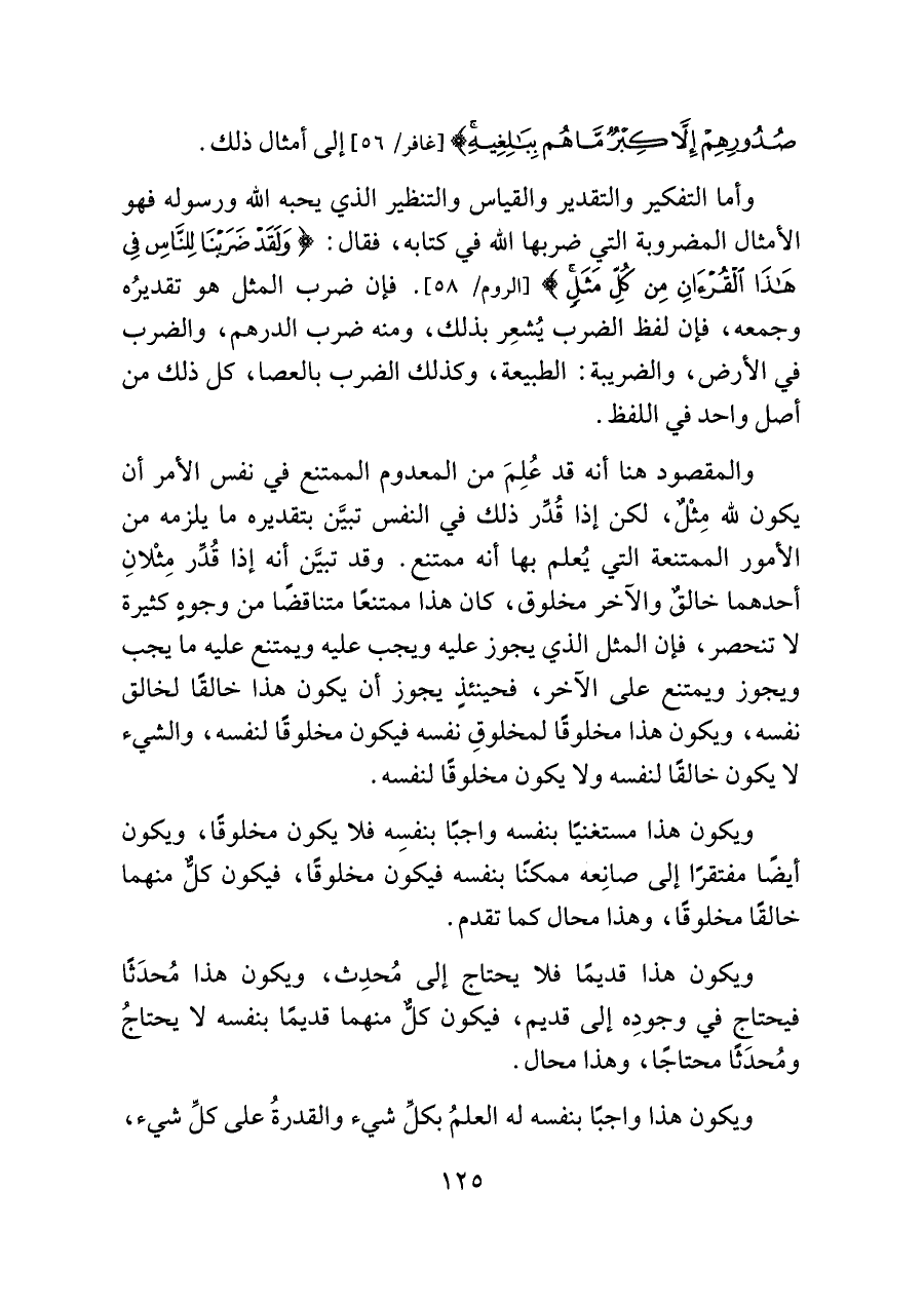 والمقصود هنا أنه قد عُلِمَ من المعدوم الممتنع في نفس الأمر أن يكون لله مِثْلٌ، لكن إذا قُدِّر ذلك في النفس تبيَّن بتقديره ما يلزمه من الأمور الممتنعة التي يُعلم بها أنه ممتنع. وقد تبيَّن أنه إذا قُدِّر مِثْلانِ أحدهما خالقٌ والآخر مخلوق، كان هذا ممتنعًا متناقضًا من وجوهٍ كثيرة لا تنحصر، فإن المثل الذي يجوز عليه ويجب عليه ويمتنع عليه ما يجب ويجوز ويمتنع على الآخر، فحينئذٍ يجوز أن يكون هذا خالقًا لخالق نفسه، ويكون هذا مخلوقًا لمخلوقِ نفسه فيكون مخلوقًا لنفسه، والشيء لا يكون خالقًا لنفسه ولا يكون مخلوقًا لنفسه.
