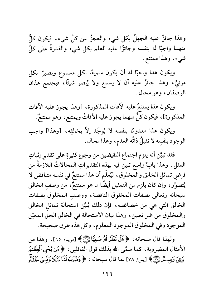فقد تبيَّن أنه يلزم اجتماع النقيضين من وجوهٍ كثيرةٍ على تقديرِ إثباتِ المثل. وهذا بابٌ واسع تبين فيه بهذه التقديراتِ المحالاتُ اللازمةُ من فرضِ تماثلِ الخالق والمخلوق، ليُعلَم أن هذا ممتنعٌ في نفسه متناقض لا يُتصوَّر، وإن كان يلزم من التمثيل أيضًا ما هو ممتنعٌ، من وصفِ الخالق سبحانه وتعالى بصفات المخلوق الناقصة، ووصفِ المخلوق بصفات الخالق التي هي من خصائصه، فإن ذلك يُبيِّن استحالة تماثلِ الخالق والمخلوق من غير تعيين، وهذا بيان الاستحالة في الخالق الحق المعيّن الموجود وفي المخلوق الموجود المعلوم، وكل هذه طرق صحيحة.