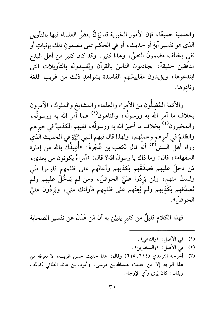 والأئمة المُضِلُّون من الأمراء والعلماء والمشايخ والملوك، الآمرون بخلاف ما أمر الله به ورسولُه، والناهون (¬١) عما أمر الله به ورسولُه، والمخبرون (¬٢) بخلاف ما أخبرَ الله به ورسولُه، ففيهم الكذبُ في خبرِهم والظلمُ في أمرِهم وعلمِهم، ولهذا قال فيهم النبي صلى الله عليه وسلم في الحديث الذي رواه أهل السنن (¬٣) أنه قال لكعب بن عُجْرَة: "أُعِيذُك بالله من إمارة السفهاء"، قال: وما ذاك يا رسولَ الله؟ قال: "أمراءُ يكونون من بعدي، مَن دخلَ عليهم فصدَّقَهم بكذبهم وأعانَهم على ظلمهم فليسوا منِّي ولستُ منهم، ولن يَرِدُوا عليَّ الحوضَ، ومن لم يَدخُلْ عليهم ولم يُصَدِّقهم بكَذِبهم ولم يُعِنْهم على ظلمِهم فأولئك مني، ويَرِدُون عليَّ الحوضَ".