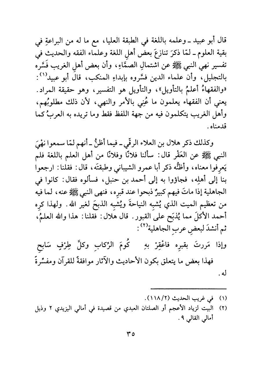 قال أبو عبيد - وعلمه باللغة في الطبقة العليا، مع ما له من البراعةِ في بقية العلوم - لمّا ذكرَ تنازعَ بعض أهلِ اللغة وعلماء الفقه والحديث في تفسير نهي النبي صلى الله عليه وسلم عن اشتمالِ الصمَّاءِ، وأن بعض أهلِ الغريب فَسَّره بالتجليل، وأن علماء الدين فسَّروه بإبداءِ المنكب، قال أبو عبيد (¬١): "والفقهاءُ أعلمُ بالتأويل"، والتأويل هو التفسير، وهو حقيقة المراد. يعني أن الفقهاء يعلمون ما عُنِي بالأمر والنهي، لأن ذلك مطلوبُهم، وأهل الغريب يتكلمون فيه من جهة اللفظ فقط وما تريده به العربُ كما قدمناه.