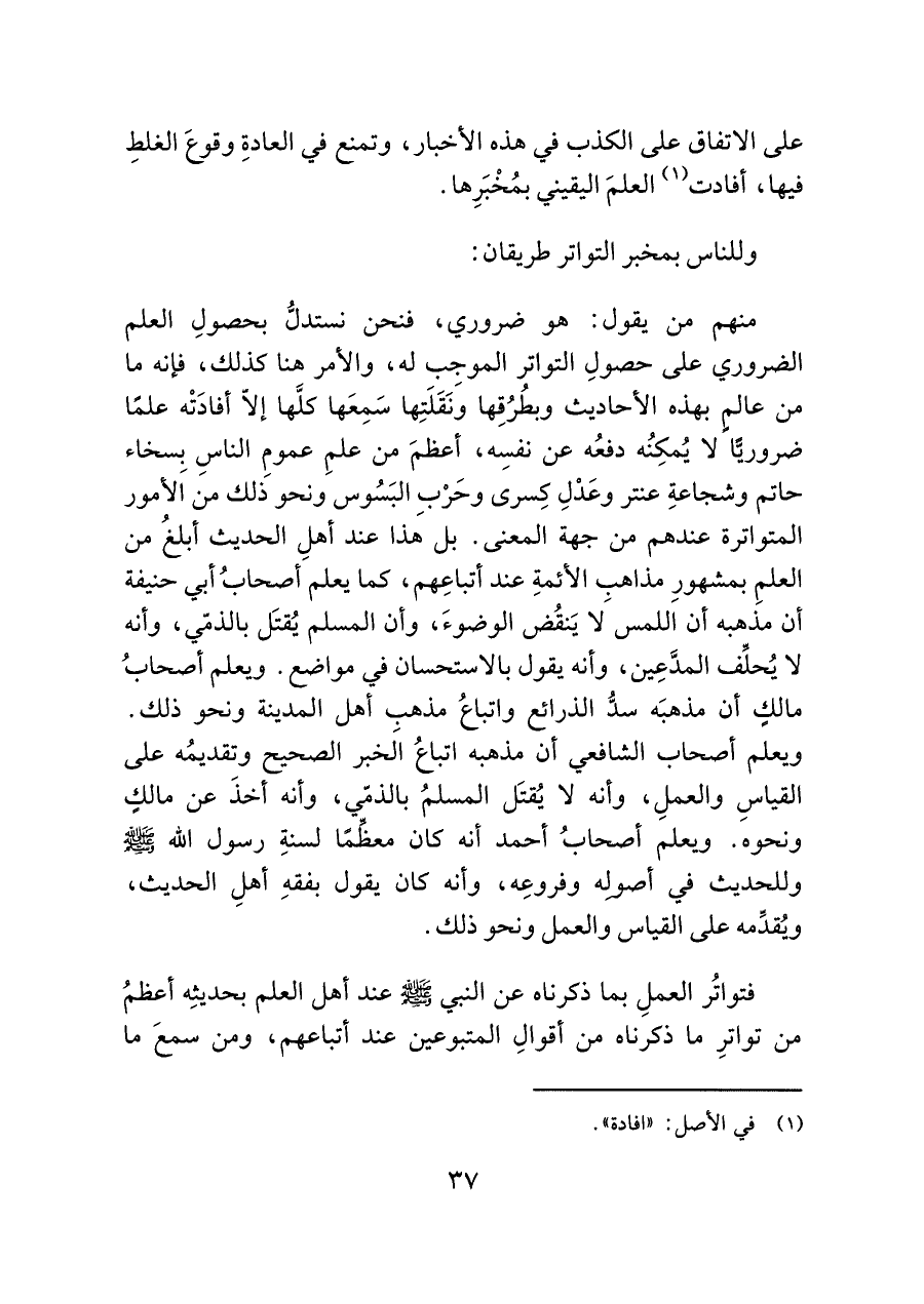 منهم من يقول: هو ضروري، فنحن نستدلُّ بحصولِ العلم الضروري على حصولِ التواتر الموجِبِ له، والأمر هنا كذلك، فإنه ما من عالمٍ بهذه الأحاديث وبطُرُقِها ونَقَلَتِها سَمِعَها كلَّها إلّا أفادَتْه علمًا ضروريًّا لا يُمكِنُه دفعُه عن نفسِه، أعظمَ من علمِ عمومِ الناسِ بِسخاء حاتم وشجاعةِ عنتر وعَدْلِ كِسرى وحَرْبِ البَسُوس ونحو ذلك من الأمور المتواترة عندهم من جهة المعنى. بل هذا عند أهلِ الحديث أبلغُ من العلمِ بمشهورِ مذاهبِ الأئمةِ عند أتباعِهم، كما يعلمُ أصحابُ أبي حنيفة أن مذهبه أن اللمس لا يَنقُض الوضوءَ، وأن المسلم يُقتَل بالذمّي، وأنه لا يُحلِّف المدَّعِين، وأنه يقول بالاستحسان في مواضع. ويعلم أصحابُ مالك أن مذهبه سدُّ الذرائع واتباعُ مذهب أهل المدينة ونحو ذلك. ويعلم أصحاب الشافعي أن مذهبه اتباعُ الخبر الصحيح وتقديمُه على القياسِ والعملِ، وأنه لا يُقتَل المسلمُ بالذمّي، وأنه أخذَ عن مالكٍ ونحوه. ويعلم أصحابُ أحمد أنه كان معظِّمًا لسنةِ رسول الله صلى الله عليه وسلم وللحديث في أصولِه وفروعِه، وأنه كان يقول بفقهِ أهلِ الحديث، ويُقدِّمه على القياس والعمل ونحو ذلك.