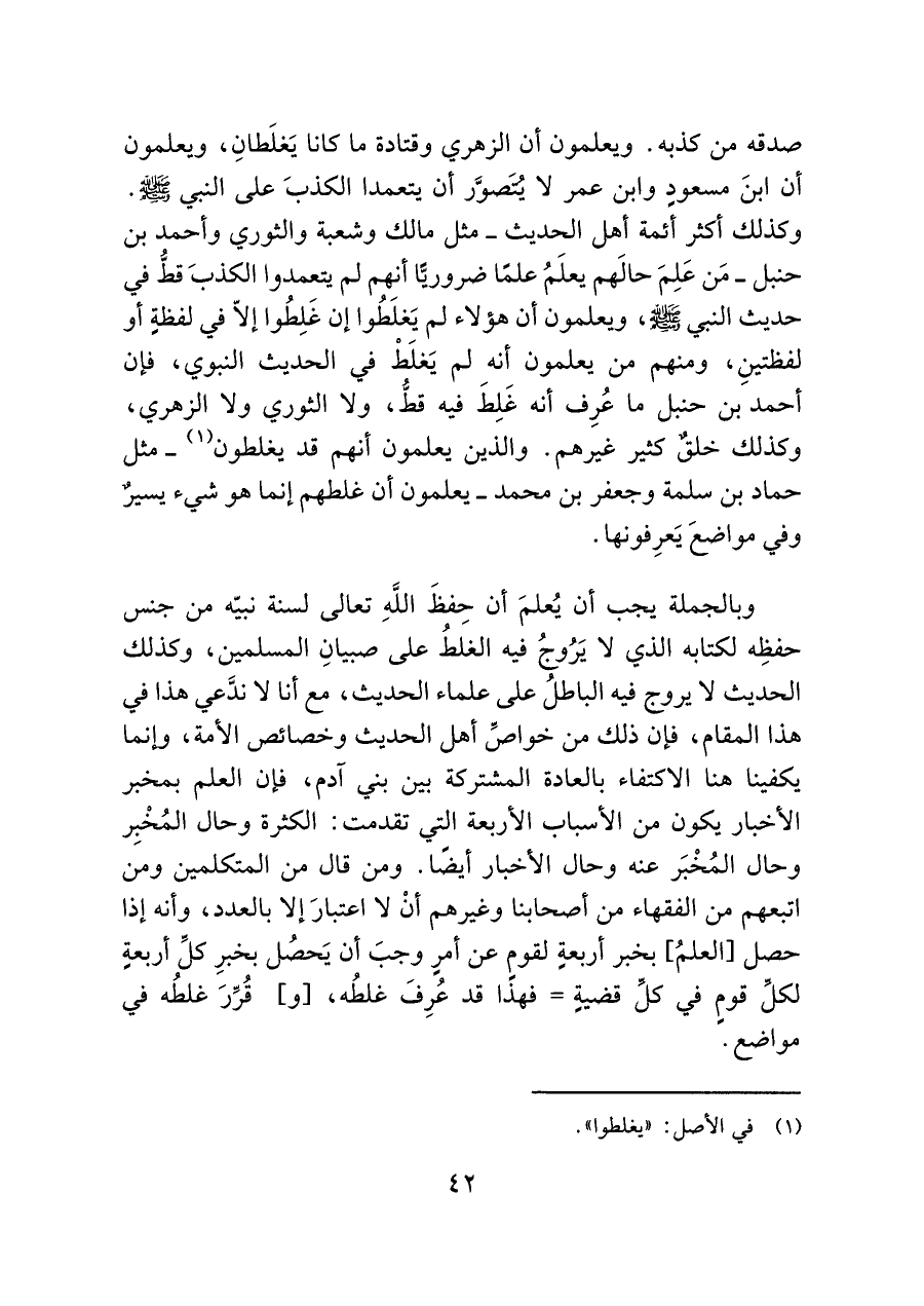 وبالجملة يجب أن يُعلَم أن حِفظَ اللهِ تعالى لسنة نبيّه من جنس حفظِه لكتابة الذي لا يَرُوجُ فيه الغلطُ على صبيانِ المسلمين، وكذلك الحديث لا يروج فيه الباطلُ على علماء الحديث، مع أنا لا ندَّعي هذا في هذا المقام، فإن ذلك من خواصِّ أهل الحديث وخصائص الأمة، وإنما يكفينا هنا الاكتفاء بالعادة المشتركة بين بني آدم، فإن العلم بمخبر الأخبار يكون من الأسباب الأربعة التي تقدمت: الكثرة وحال المُخْبِر وحال المُخْبَر عنه وحال الأخبار أيضًا. ومن قال من المتكلمين ومن اتبعهم من الفقهاء من أصحابنا وغيرهم أنْ لا اعتبارَ إلا بالعدد، وأنه إذا حصل [العلمُ] بخبر أربعةٍ لقوم عن أمرٍ وجبَ أن يَحصُل بخبرِ كلِّ أربعةٍ لكلِّ قومٍ في كلِّ قضيةٍ = فهذا قد عُرِفَ غلطُه، [و] قُرِّرَ غلطُه في مواضع.