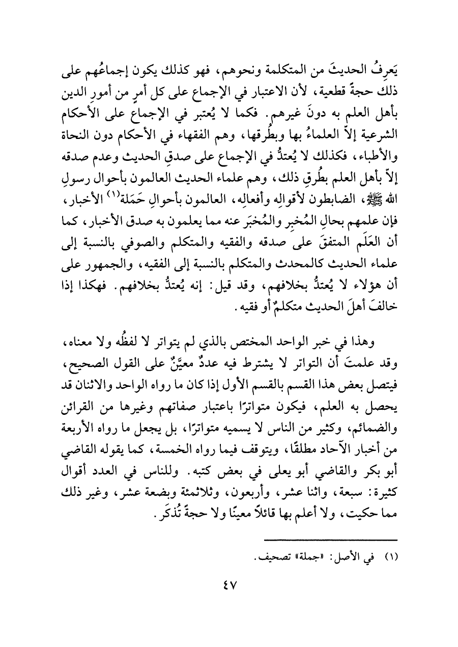 يَعرِفُ الحديثَ من المتكلمة ونحوهم، فهو كذلك يكون إجماعُهم على ذلك حجةً قطعية، لأن الاعتبار في الإجماع على كل أمرٍ من أمورِ الدين بأهل العلم به دونَ غيرهم. فكما لا يُعتبر في الإجماع على الأحكام الشرعية إلّا العلماءُ بها وبطُرقها، وهم الفقهاء في الأحكام دون النحاة والأطباء، فكذلك لا يُعتدُّ في الإجماع على صدقِ الحديث وعدم صدقه إلّا بأهل العلم بطُرقِ ذلك، وهم علماء الحديث العالمون بأحوال رسولِ الله صلى الله عليه وسلم، الضابطون لأقوالِه وأفعالِه، العالمون بأحوال حَمَلة (¬١) الأخبار، فإن علمهم بحالِ المُخبِر والمُخبَر عنه مما يعلمون به صدق الأخبار، كما أن العَلَم المتفقَ على صدقه والفقيه والمتكلم والصوفي بالنسبة إلى علماء الحديث كالمحدث والمتكلم بالنسبة إلى الفقيه، والجمهور على أن هؤلاء لا يُعتدُّ بخلافهم، وقد قيل: إنه يُعتدُّ بخلافهم. فهكذا إذا خالف أهلَ الحديث متكلمٌ أو فقيه.