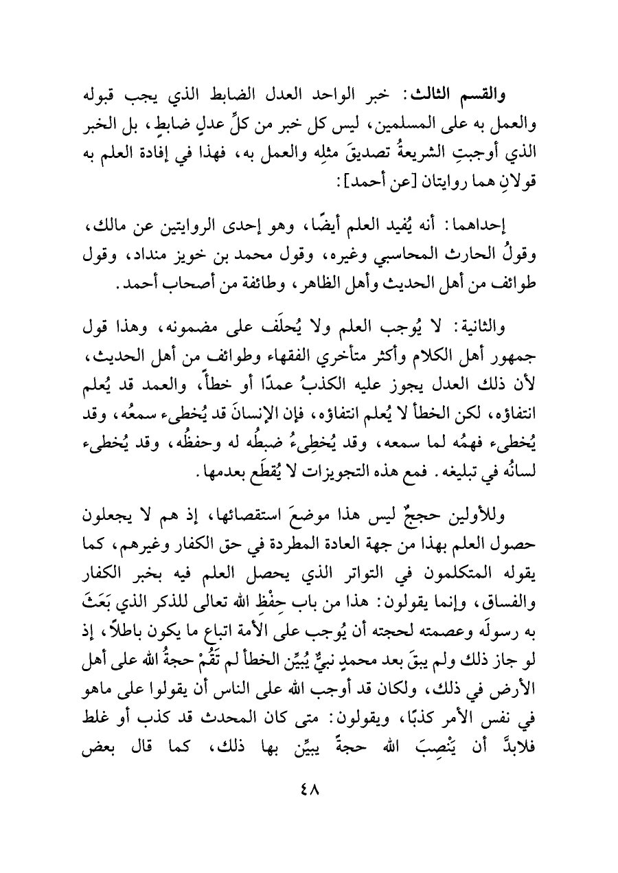 والقسم الثالث: خبر الواحد العدل الضابط الذي يجب قبوله والعمل به على المسلمين، ليس كل خبر من كلِّ عدلٍ ضابطٍ، بل الخبر الذي أوجبتِ الشريعةُ تصديقَ مثلِه والعمل به، فهذا في إفادة العلم به قولانِ هما روايتان [عن أحمد]: