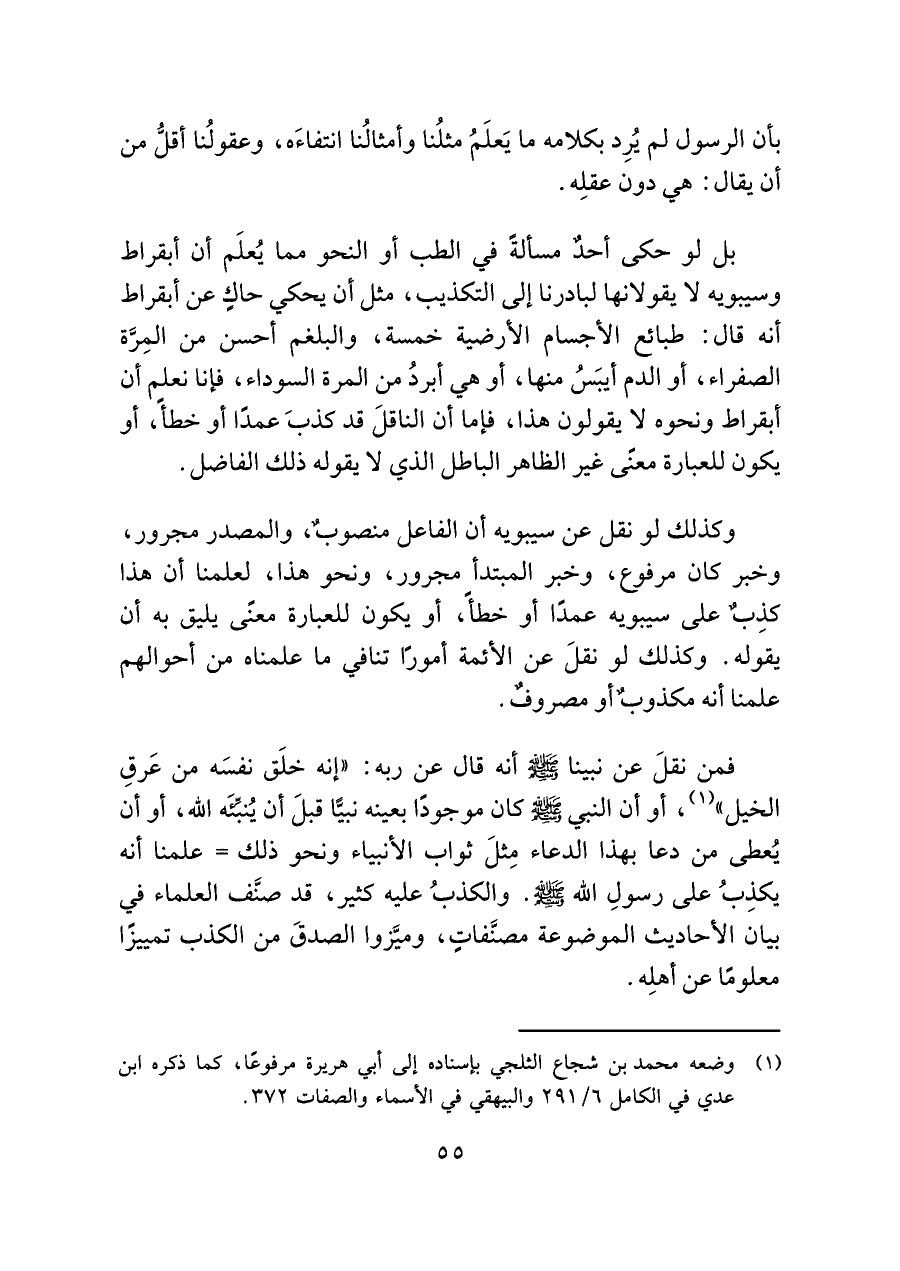 بل لو حكى أحدٌ مسألةً في الطب أو النحو مما يُعلَم أن أبقراط وسيبويه لا يقولانها لبادرنا إلى التكذيب، مثل أن يحكي حاكٍ عن أبقراط أنه قال: طبائع الأجسام الأرضية خمسة، والبلغم أحسن من المِرَّة الصفراء، أو الدم أيبَسُ منها، أو هي أبردُ من المرة السوداء، فإنا نعلم أن أبقراط ونحوه لا يقولون هذا، فإما أن الناقلَ قد كذبَ عمدًا أو خطأً، أو يكون للعبارة معنًى غير الظاهر الباطل الذي لا يقوله ذلك الفاضل.