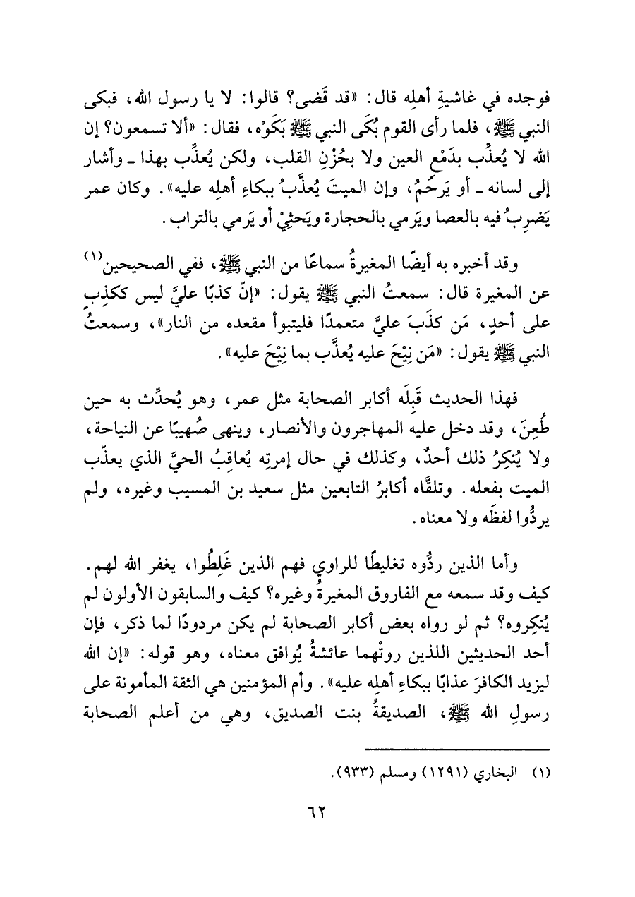 كيف وقد سمعه مع الفاروق المغيرةُ وغيره؟ كيف والسابقون الأولون لم يُنكِروه؟ ثم لو رواه بعض أكابر الصحابة لم يكن مردودًا لما ذكر، فإن أحد الحديثين اللذين روتْهما عائشةُ يُوافق معناه، وهو قوله: "إن الله ليزيد الكافرَ عذابًا ببكاءِ أهلِه عليه". وأم المؤمنين هي الثقة المأمونة على رسولِ الله صلى الله عليه وسلم، الصديقةُ بنت الصديق، وهي من أعلم الصحابة