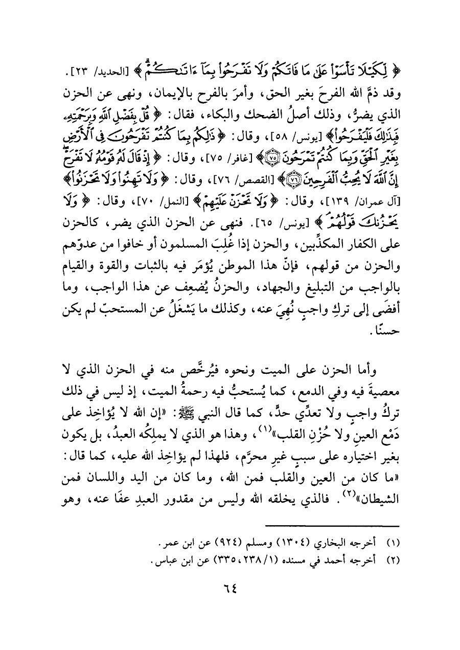 {لِكَيْلَا تَأْسَوْا عَلَى مَا فَاتَكُمْ وَلَا تَفْرَحُوا بِمَا آتَاكُمْ} [الحديد/ ٢٣]. وقد ذمَّ الله الفرحَ بغير الحق، وأمرَ بالفرح بالإيمان، ونهى عن الحزن الذي يضرُّ، وذلك أصلُ الضحك والبكاء، فقال: {قُلْ بِفَضْلِ اللَّهِ وَبِرَحْمَتِهِ فَبِذَلِكَ فَلْيَفْرَحُوا} [يونس/ ٥٨]، وقال: {ذَلِكُم بِمَا كُنتُمْ تَفْرَحُونَ فِي الْأَرْضِ بِغَيْرِ الْحَقِّ وَبِمَا كُنتُمْ تَمْرَحُونَ} [غافر/ ٧٥]، وقال: {إِذْ قَالَ لَهُ قَوْمُهُ لَا تَفْرَحْ إِنَّ اللَّهَ لَا يُحِبُّ الْفَرِحِينَ} [القصص/ ٧٦]، وقال: {وَلَا تَهِنُوا وَلَا تَحْزَنُوا} [آل عمران/ ١٣٩]، وقال: {وَلَا تَحْزَنْ عَلَيْهِمْ} [النمل/ ٧٠]، وقال: {وَلَا يَحْزُنكَ قَوْلُهُمْ} [يونس/ ٦٥]. فنهى عن الحزن الذي يضر، كالحزن على الكفار المكذِّبين، والحزن إذا غُلِبَ المسلمون أو خافوا من عدوّهم والحزن من قولهم، فإنّ هذا الموطن يُؤْمَر فيه بالثبات والقوة والقيام بالواجب من التبليغ والجهاد، والحزنُ يُضعِف عن هذا الواجب، وما أفضَى إلى تركِ واجبٍ نُهِيَ عنه، وكذلك ما يَشغَلُ عن المستحبّ لم يكن حسنًا.